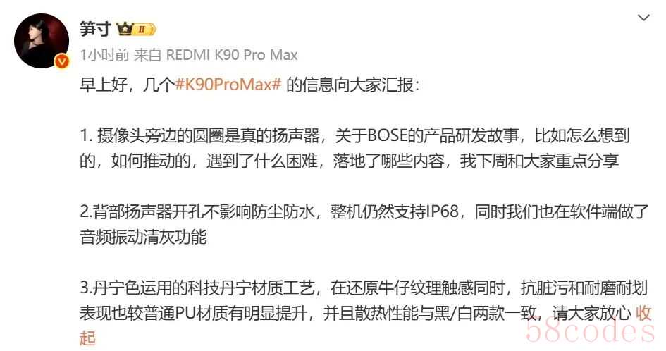 据悉,小米 REDMI K90 Pro Max 手机即将于 10 月 23 日 19:00 发布,官方今天预热了新机的扬声器配置。