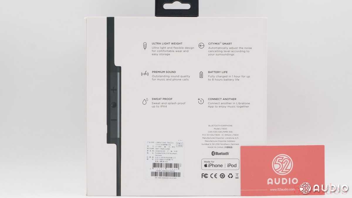 包装盒背面分别是产品卖点、线控部分特写、产品编码等,值得一提的是这款耳机获得了苹果MFi认证。包装盒的顶部有挂钩,便于卖场陈列、展示。通过与我爱音频网卡片对比,可见包装盒非常大。