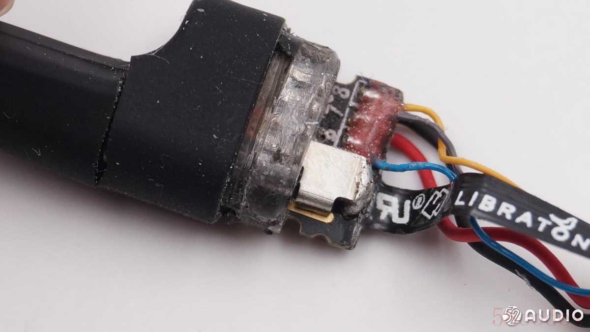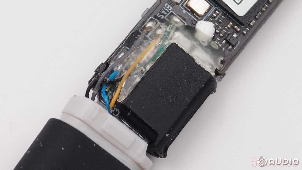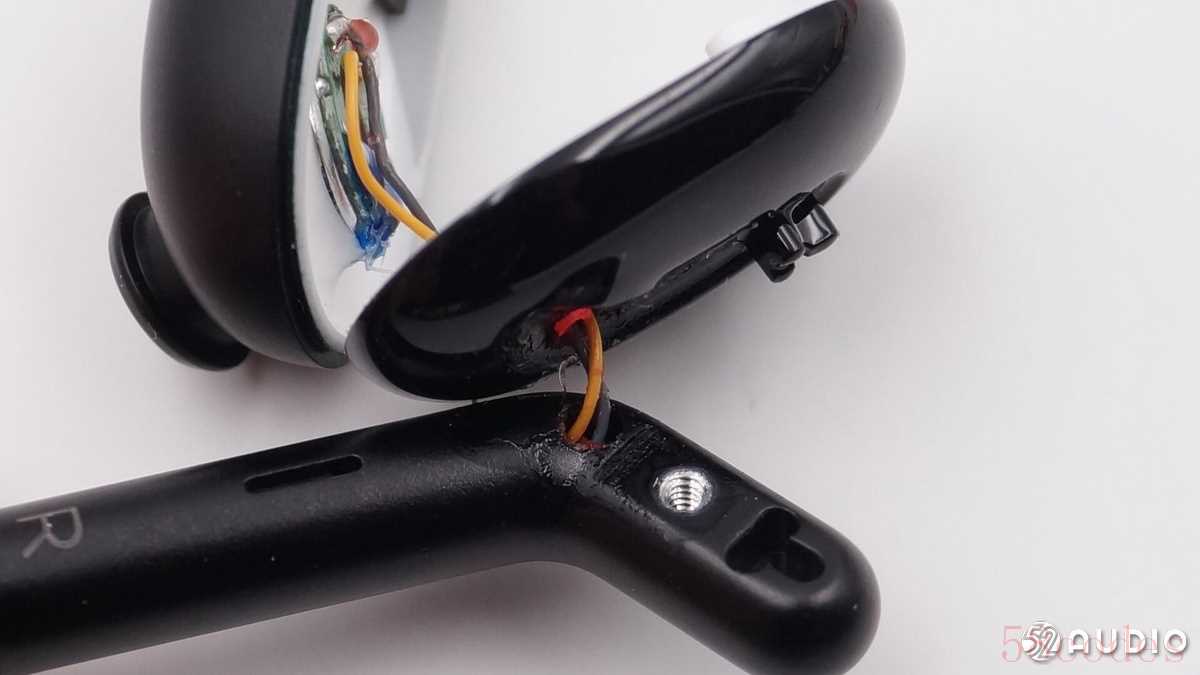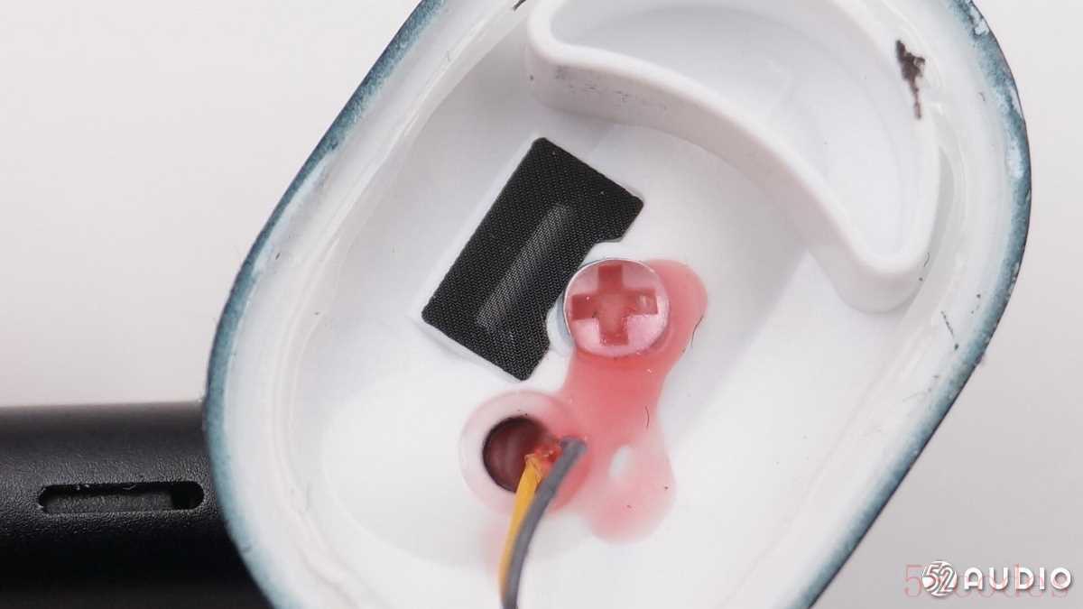 耳机外壳内部有固定胶,固定着耳机连线和一颗螺丝。