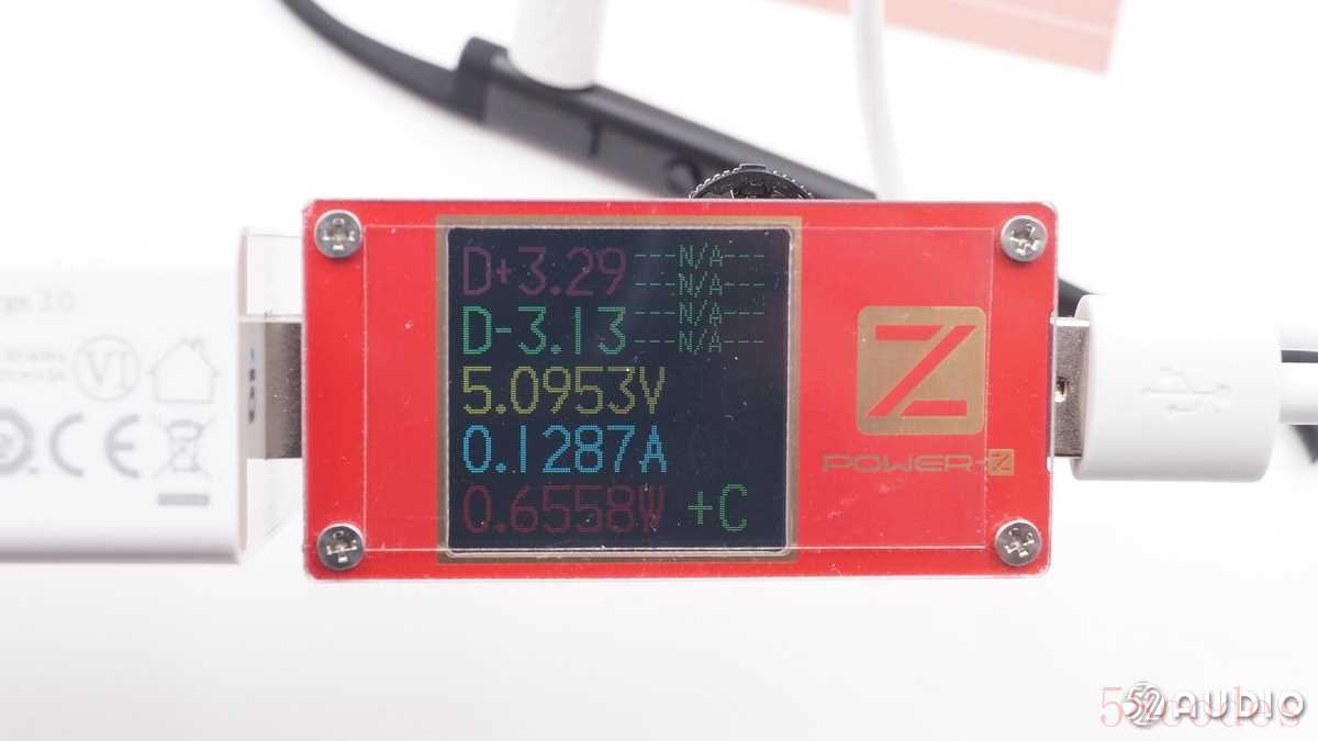 使用POWER-Z测试仪检测充电电流、电压,采用手机充电器给耳机充电,可见电压为5.095V,电流为0.128A,功率0.655W。官方宣称,仅需1小时就能充满耳机,使用长达8小时。