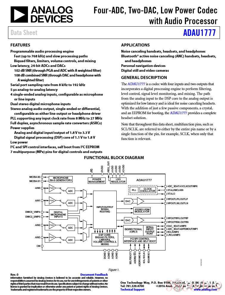 analog 亚德诺半导体 ADAU1777 4声道ADC 2声道DAC,带音频处理器的音频解编码器,支持24Bit/192KHz数字输入,很高的规格,并且还支持单端和差分输出。