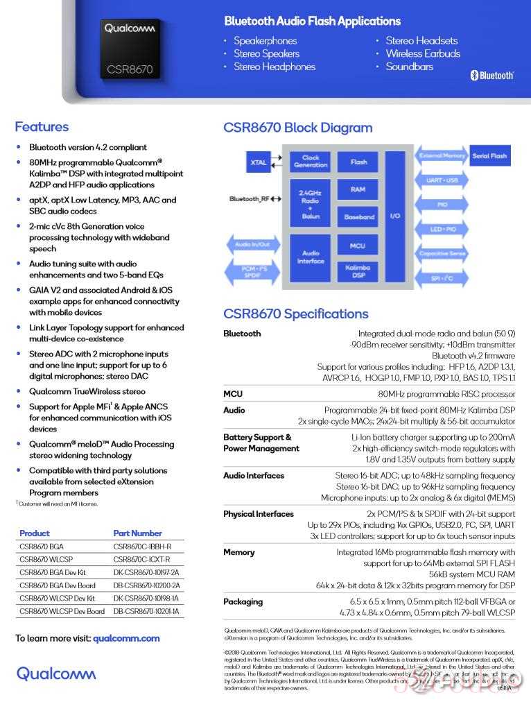 Qualcomm CSR8670详细资料,从PDF上可见支持支持aptX HiFi音频。