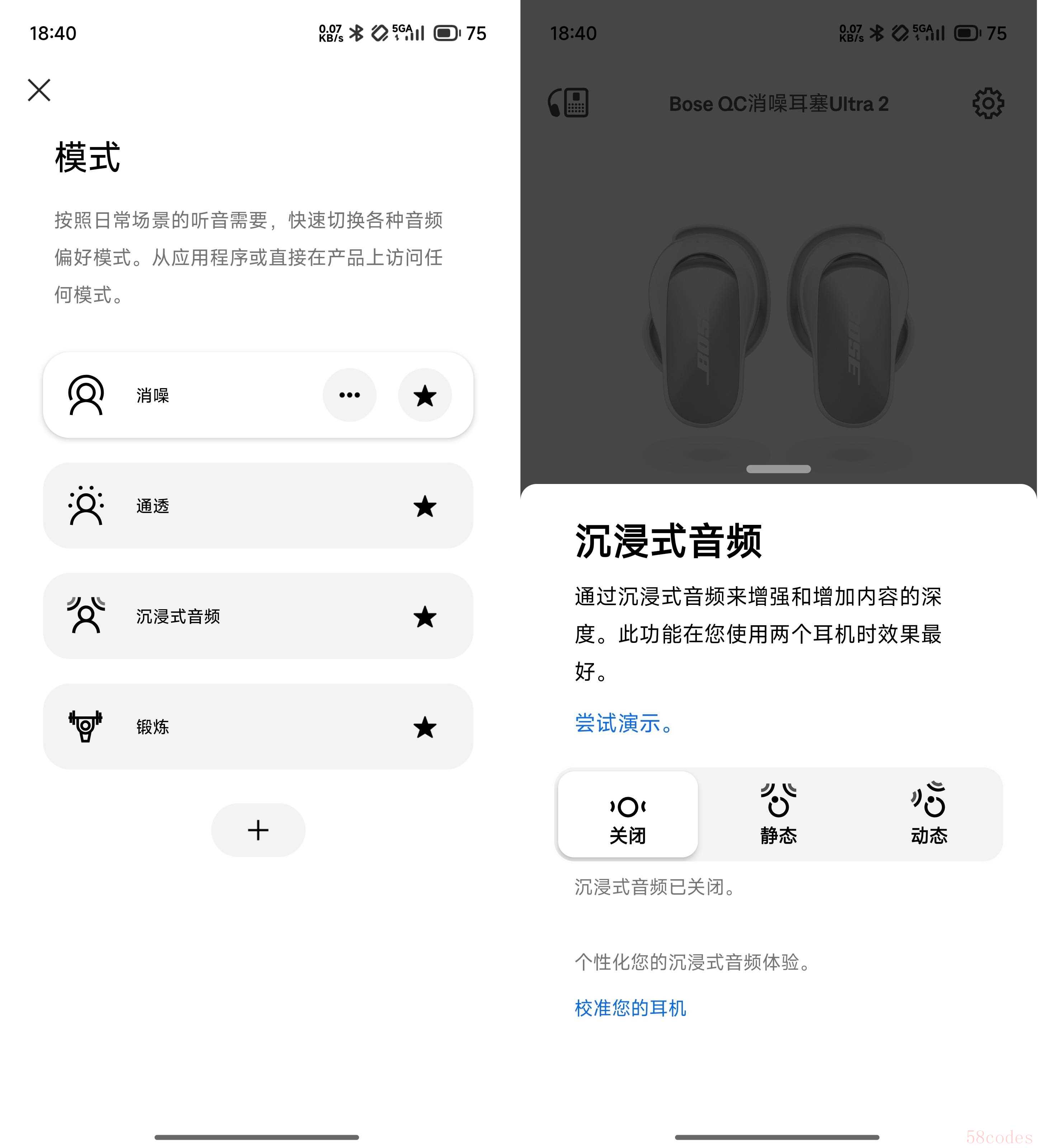 其次,我们还能开启Bose的一个自带大招「沉浸式音频」,这时整个耳机的声场就会大大加强,声音仿佛由原本的双声道变作了一个空间内,提升了听音的临场感。
