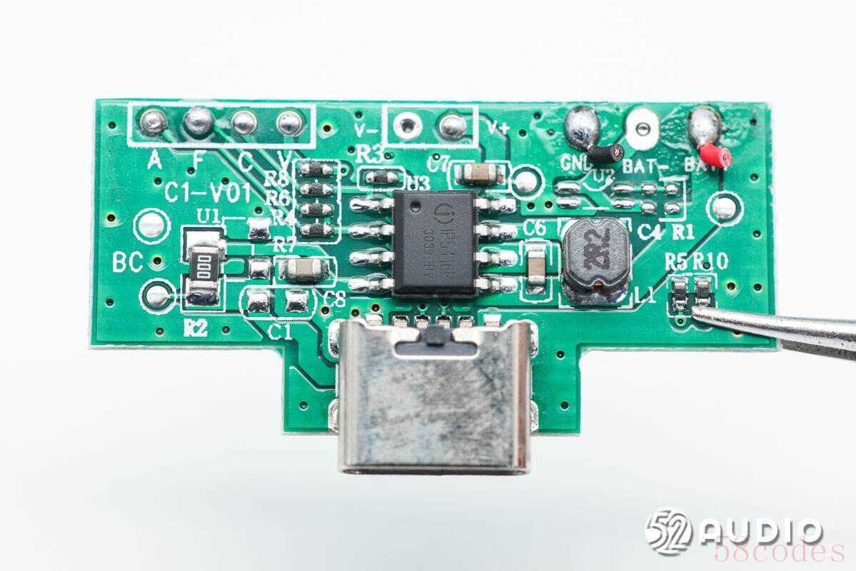 撕开固定胶带,取掉配重铁块,下方设置有为耳机充电的小板。