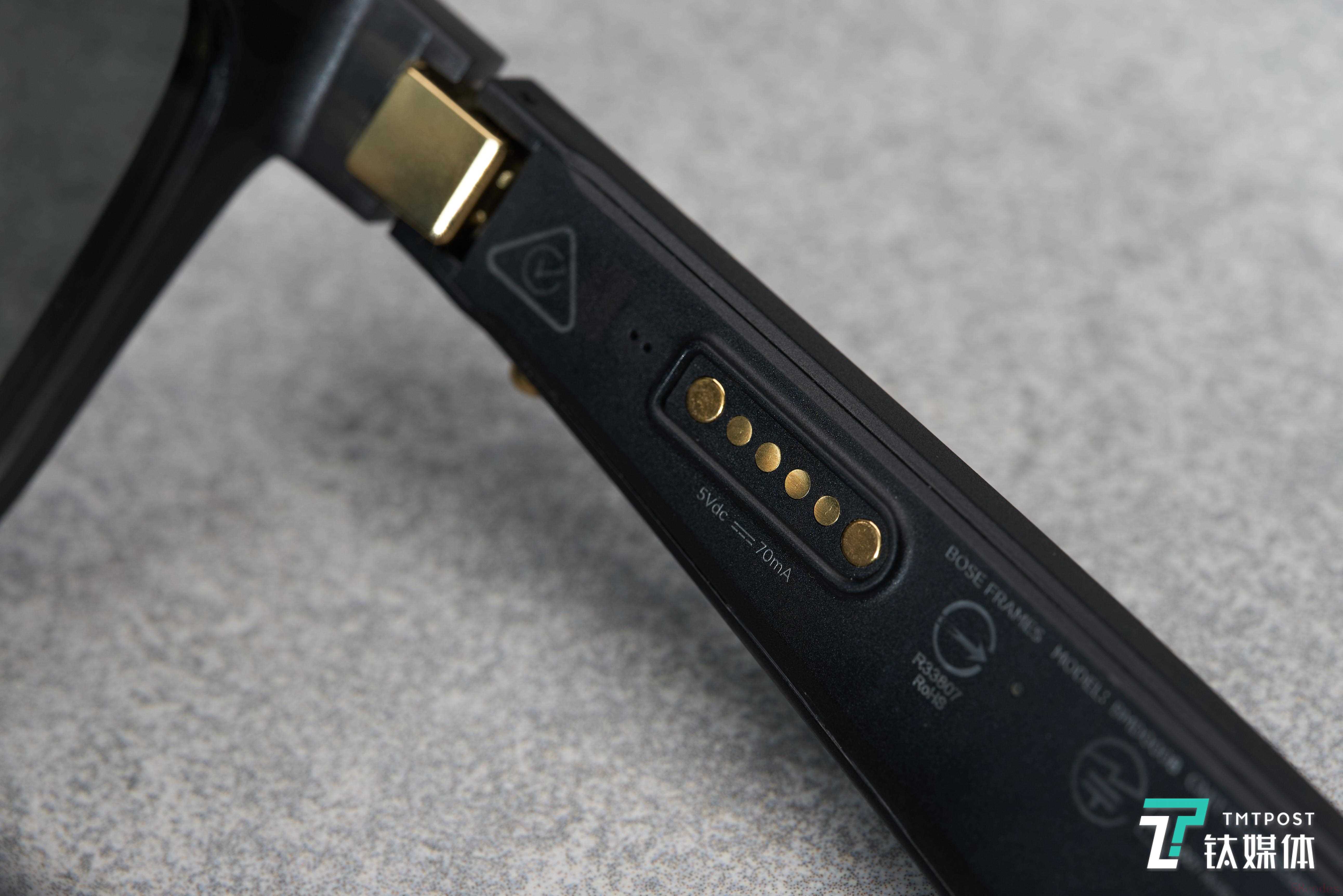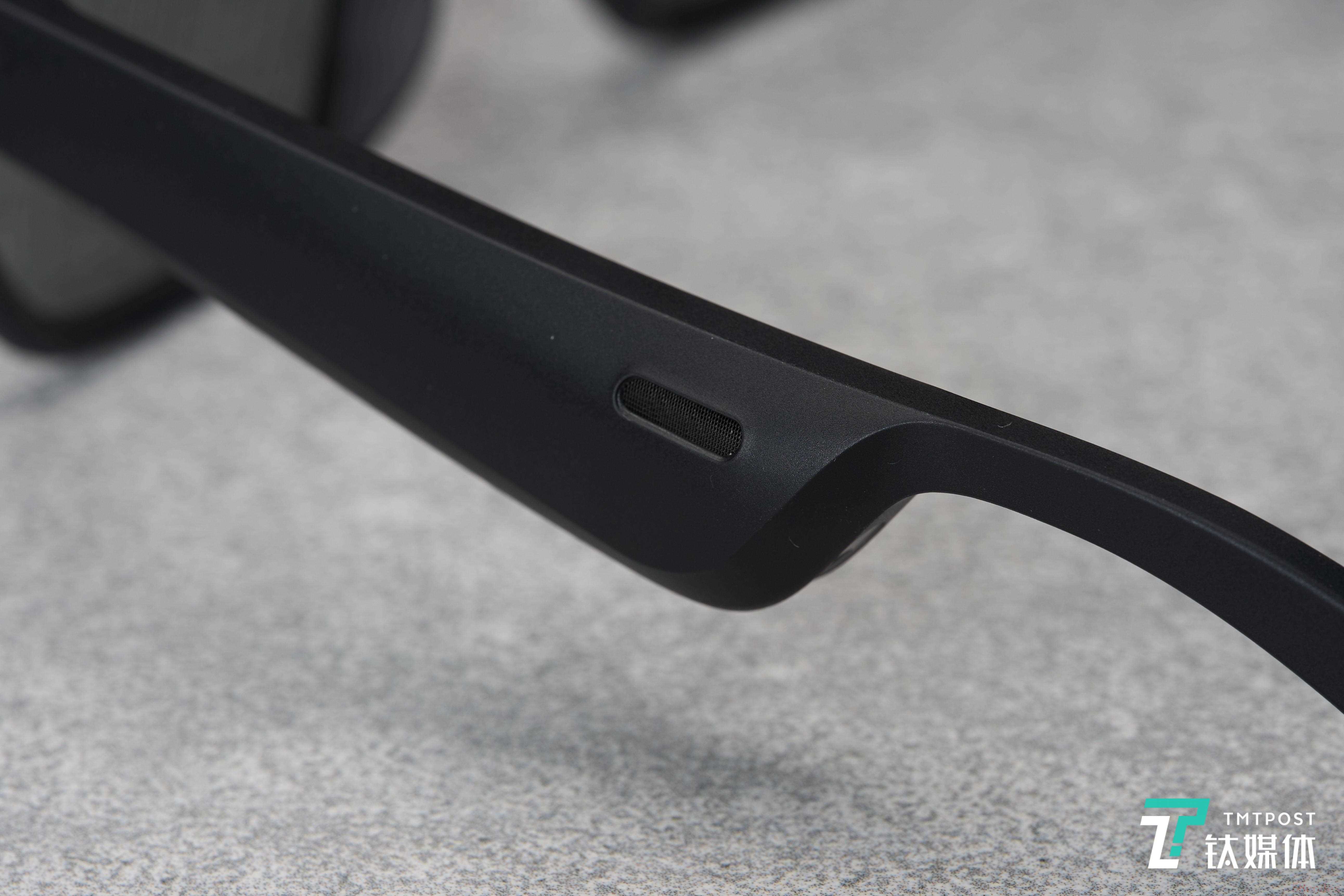 不像是此前笔者评测过的华为XGM联名款Eyewear,它并不支持无线充电。镜腿上,有裸露的金属触点,配合附赠的充电线才能充电。充电触点的下方,有一颗物理按键。这颗按键负责完成所有的交互:短按即可开机,双击/三击切换下一曲/上一曲,长按唤醒语音助手(支持Siri/Alexa等)。