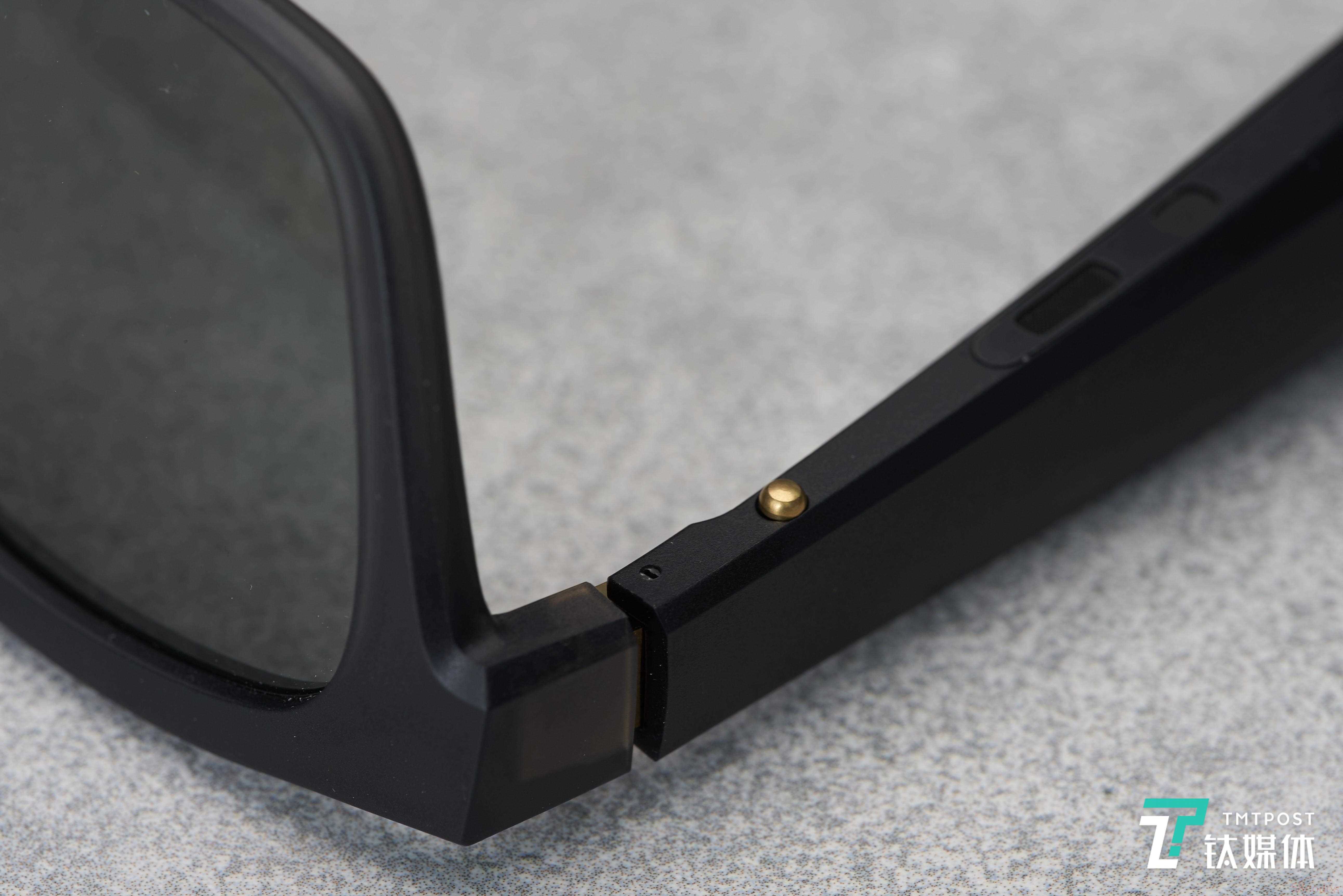 这颗金属按键并没有集成关机功能——用户需要倒置墨镜,一段时间之后,墨镜会自动关机。从使用习惯上面而言,笔者并不认为这是个好的设计。毕竟都已经有一颗物理按键了,为什么不把关机功能集成上去呢?