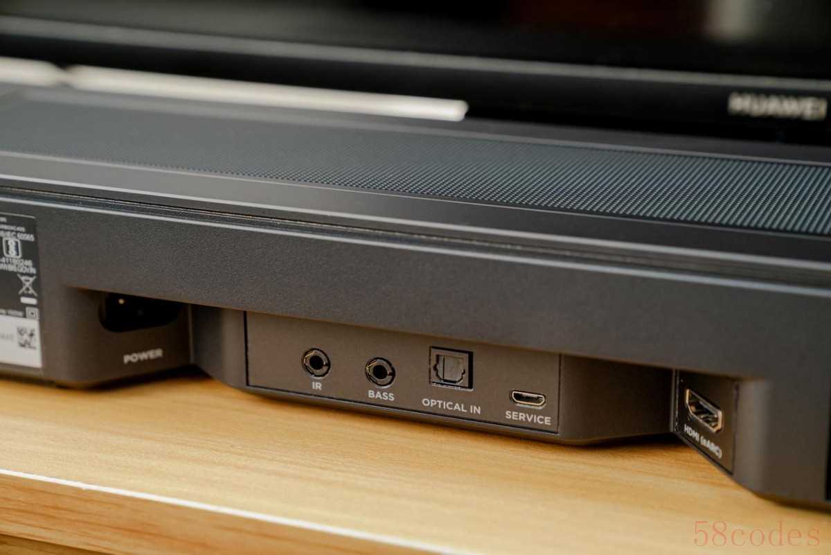 Bose家庭娱乐扬声器550的背部中央则是回音壁的接口区域,设备的电源和HDMI eARC接口位于两侧的斜面上,插拔很方便,中间的4个接口分别为IR红外接口、低音炮有线接口、光纤S/PDIF音频接口和工程服务接口。和同价位的回音壁产品比起来Bose家庭娱乐扬声器550的接口配置不算丰富,但能够满足一般的使用需求了。配件方面,除了必备的电源线外,Bose还提供了一条光纤音频线和一条1.5m长的HDMI线。