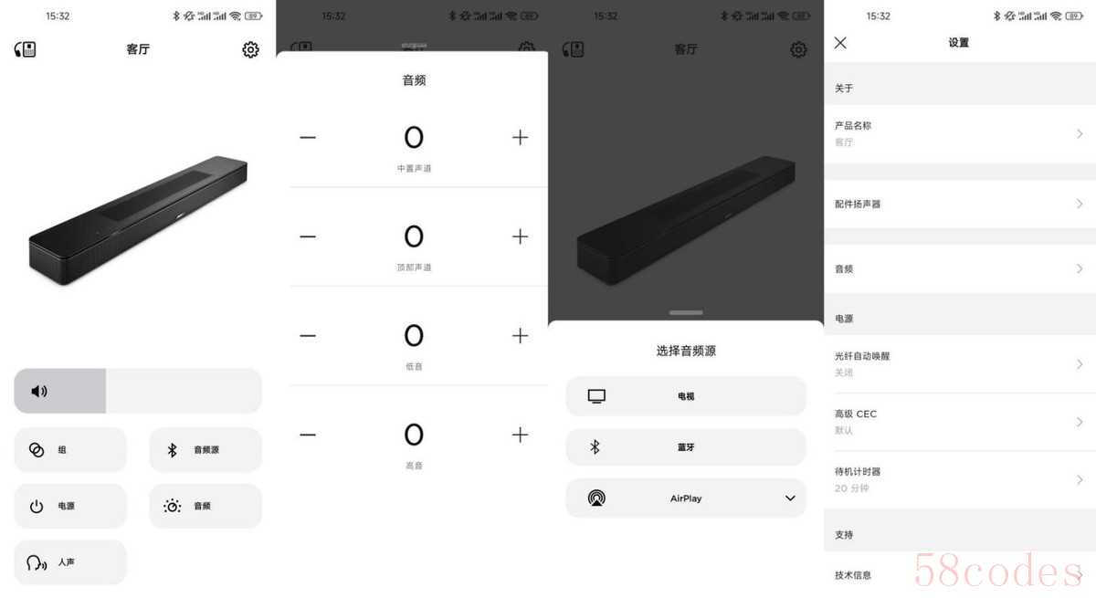 在Bose音乐APP中,可以对Bose家庭娱乐扬声器550进行音量调整、电源唤醒、音频源切换和人声模式等常用的功能,同时也支持独立调校中置、环绕声道、低频以及高音的增益。单独的设置页面中,则可以对产品命名和扬声器配件进行设置,各项操作都非常直观,APP易用性算是同类产品中最好的。