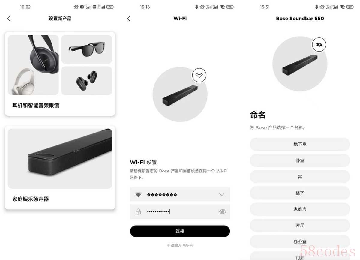 在回音壁接入电源完成启动后,需要使用Bose音乐APP完成初始化设置。首先在Bose音乐中选择“+”号,APP会提示手机打开蓝牙、WIFI和定位,然后选择并点击“家庭娱乐扬声器”即可找到Bose家庭娱乐扬声器550。产品不支持连接到中文SSID,可能需要提前把WIFI SSID切换成英文或数字,除此之外没有任何操作门槛。接下来根据APP提示连接WIFI网络,最后选择命名即可完成设置,过程简单快捷。