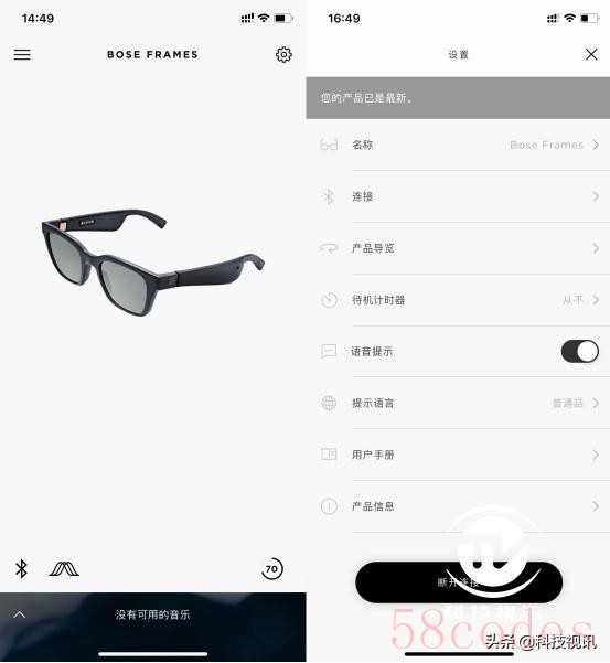 Bose Frames Alto连接非常方便, 即使不下载APP也能迅速配对,中文名设备也没有兼容问题。在摘下眼镜后会自动停止播放音乐。一键式控制也极易上手,除了按键外还可以用APP对其进行连接、语音提示等方面的设置,也非常期待APP后续功能的更新。
