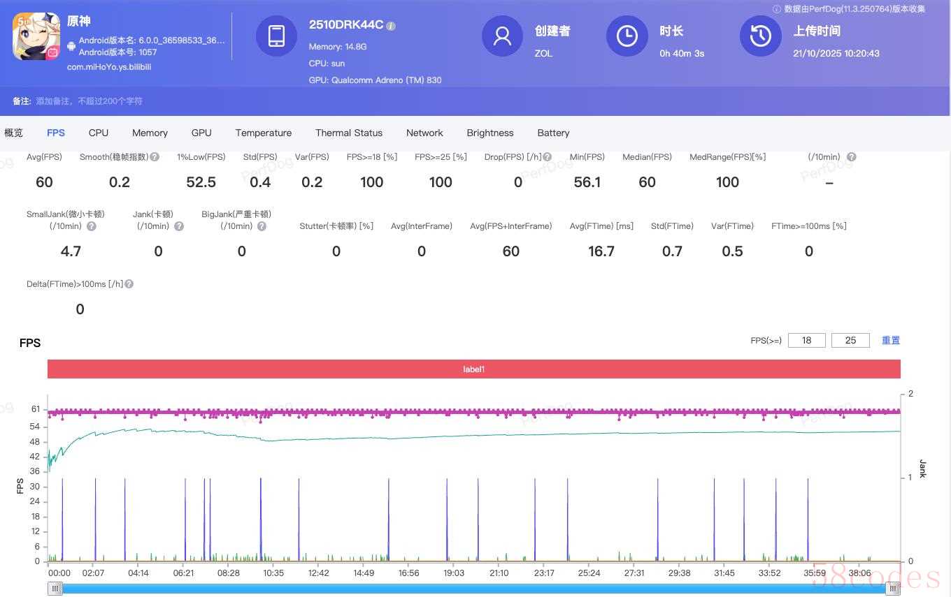 实测《原神》40分钟极限测试中,平均帧率60帧,机身最高温度仅41.3℃。相比同平台的大屏旗舰温度更低、帧率更稳,尤其1%low帧表现更优,几乎无掉帧感。