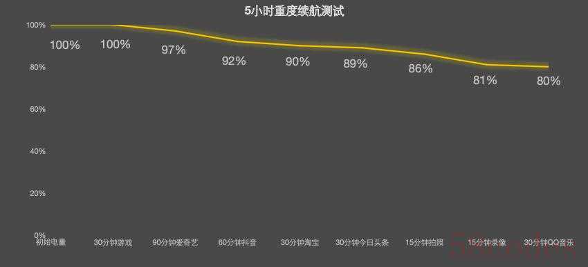 笔者采用中关村在线续航测试模型,对其进行了续航测试。在当前室温环境下,连接办公室Wi-Fi,关闭蓝牙、GPS,屏幕亮度、音量均设为50%,5小时重度使用下还有80%的电量。