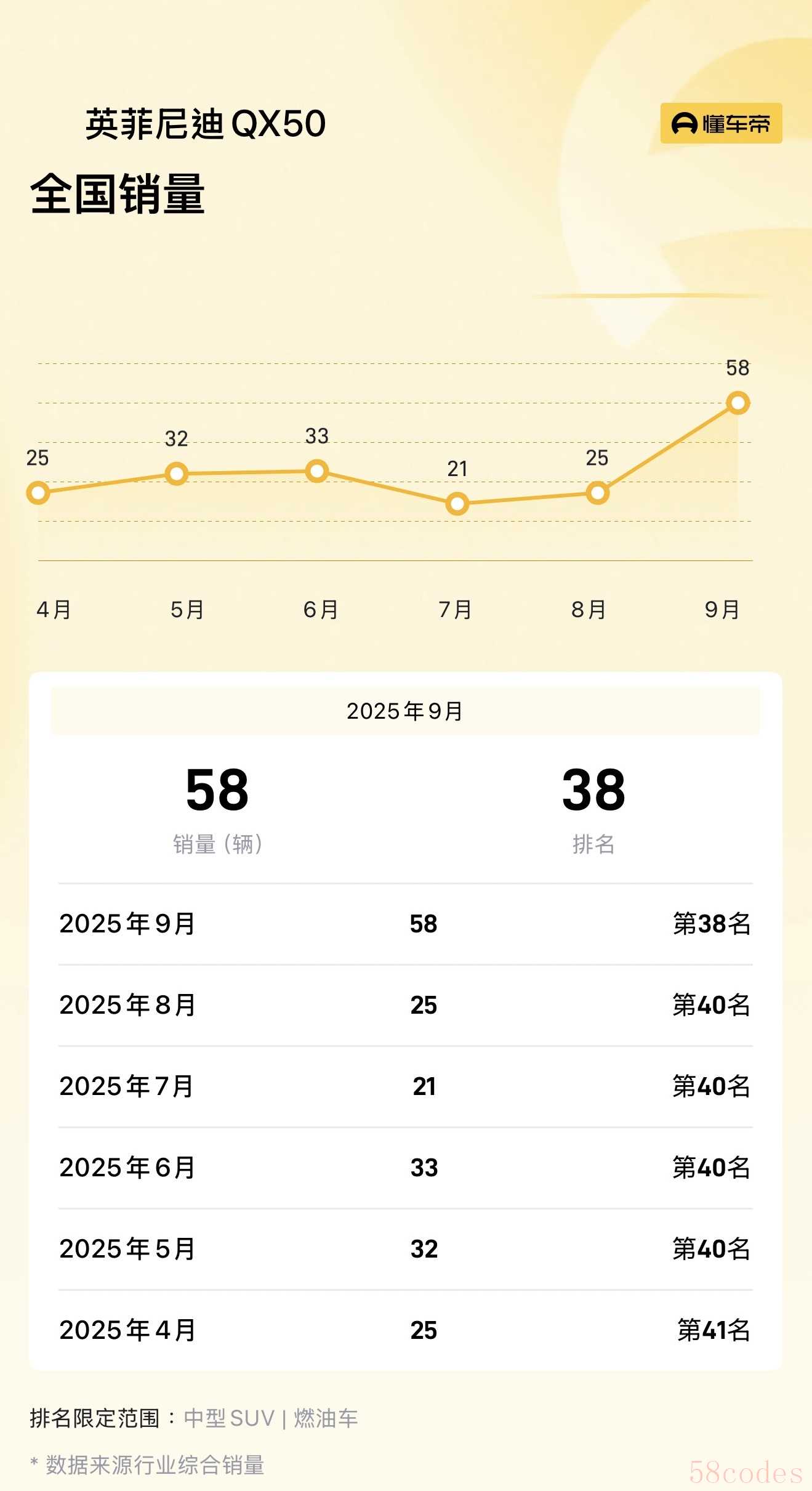 英菲尼迪QX50定位于中型SUV,根据车型级别来看,同级车型主要为沃尔沃XC60(2026款车型指导价格39.69万元起)、凯迪拉克XT5(2026款车型指导价格37.99万元起)、林肯航海家(2026款车型指导价格30.58万元起)等豪华品牌车型。结合销量数据显示,今年9月,英菲尼迪QX50销量为58辆。更多消息,懂车帝将持续关注。