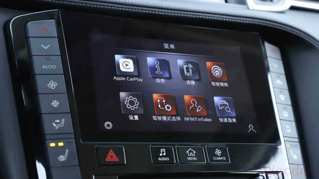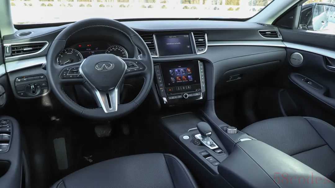 7英寸液晶仪表的两侧搭配的是机械式仪表,没有花哨的元素,一切以实用性为主;7英寸的中控屏内置有全新INFINITI InTouch 2.0智能互联系统,支持CarPlay以及CarLife连接,倒车影像功能支持多角度查看,清晰度一般。