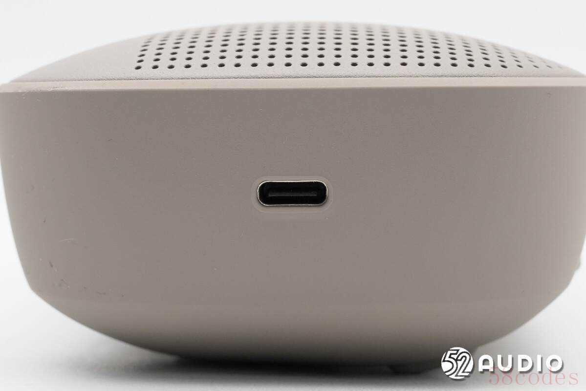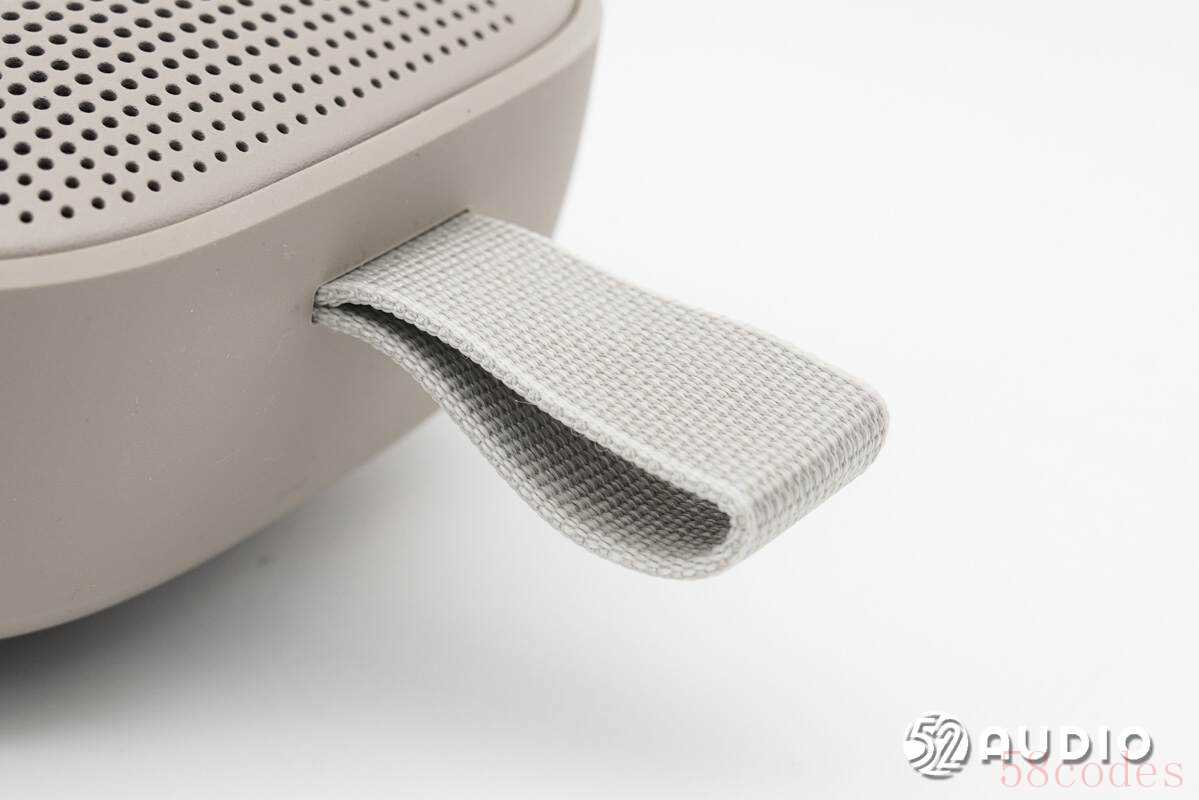 机身采用了坚韧的硅胶包裹,提升防撞防摔性能。底部设计有脚撑,便于放置。圆点矩形开孔位无源辐射振膜的出音孔,用于提升低音效果。