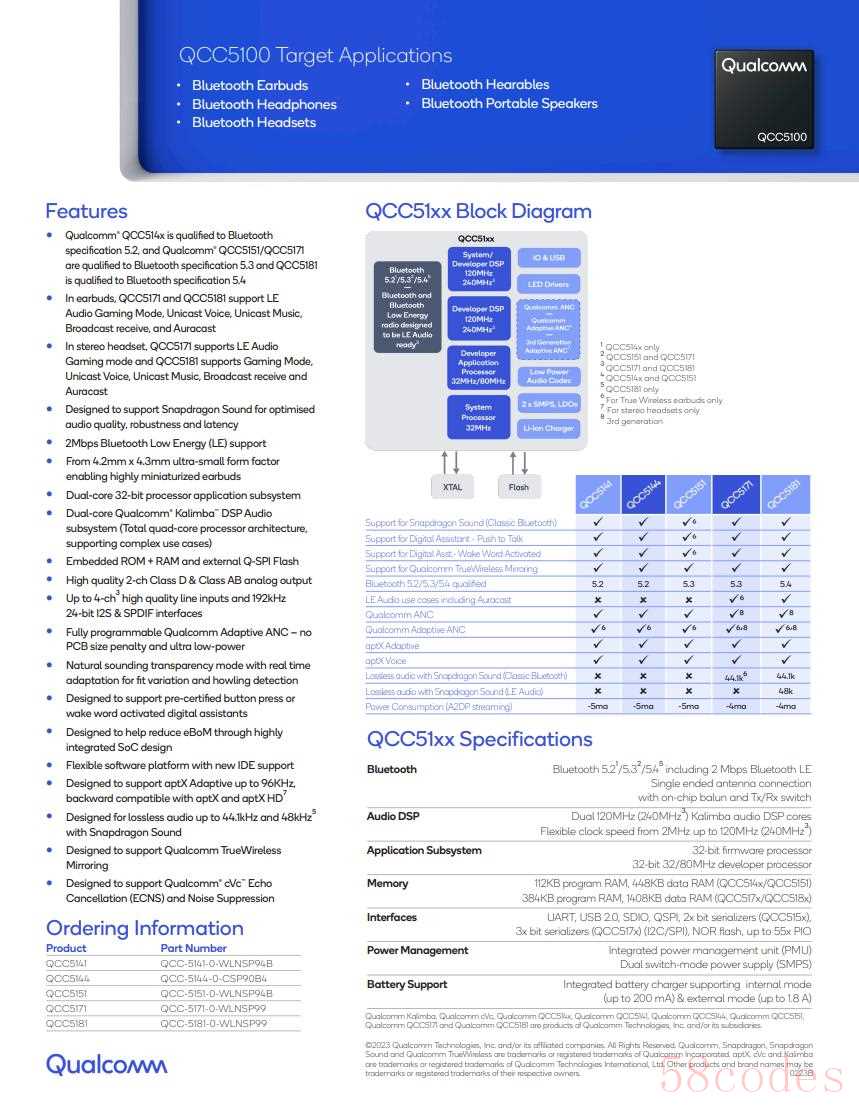 Qualcomm高通QCC51xx系列详细资料图。据我爱音频网拆解了解到,目前已有小米、韶音、Cleer、Bose、JBL、森海塞尔、B&O、雅马哈、马歇尔、SONY、谷歌、颂拓、Jabra、漫步者、OPPO、vivo、一加、荣耀、微软、QCY、Anker、飞利浦等众多品牌旗下产品采用了高通蓝牙音频方案。