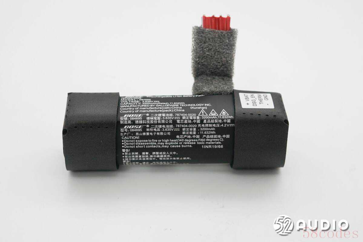 音箱内置二次锂电池组,型号:084695,标称电压:3.635V,额定容量:3200mAh,额定能量:11.632Wh,充电限制电压:4.2V,制造商:德臻科技有限公司,生产厂:昆山德寰电子有限公司。