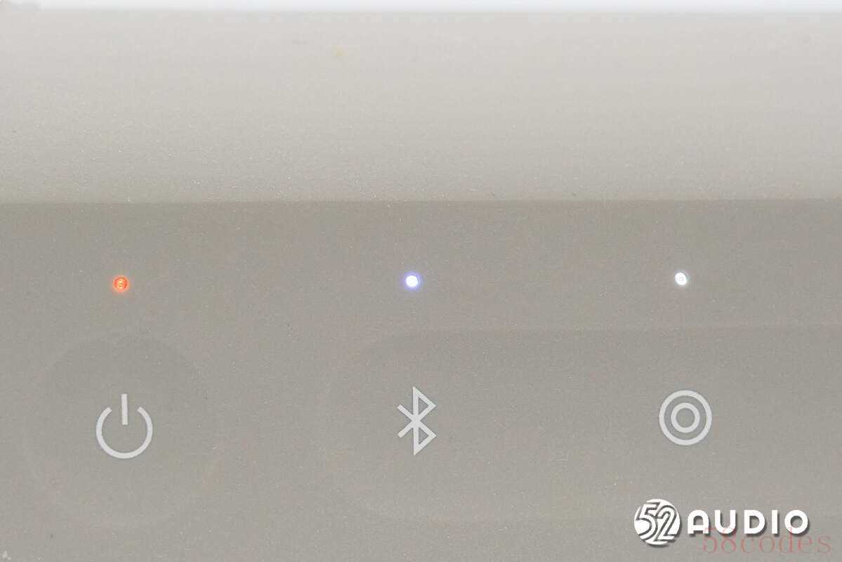 机身正面设置有功能按键,从左到右依次为音量+、播放/暂停、音量-、快捷功能键、蓝牙键、电源按钮。