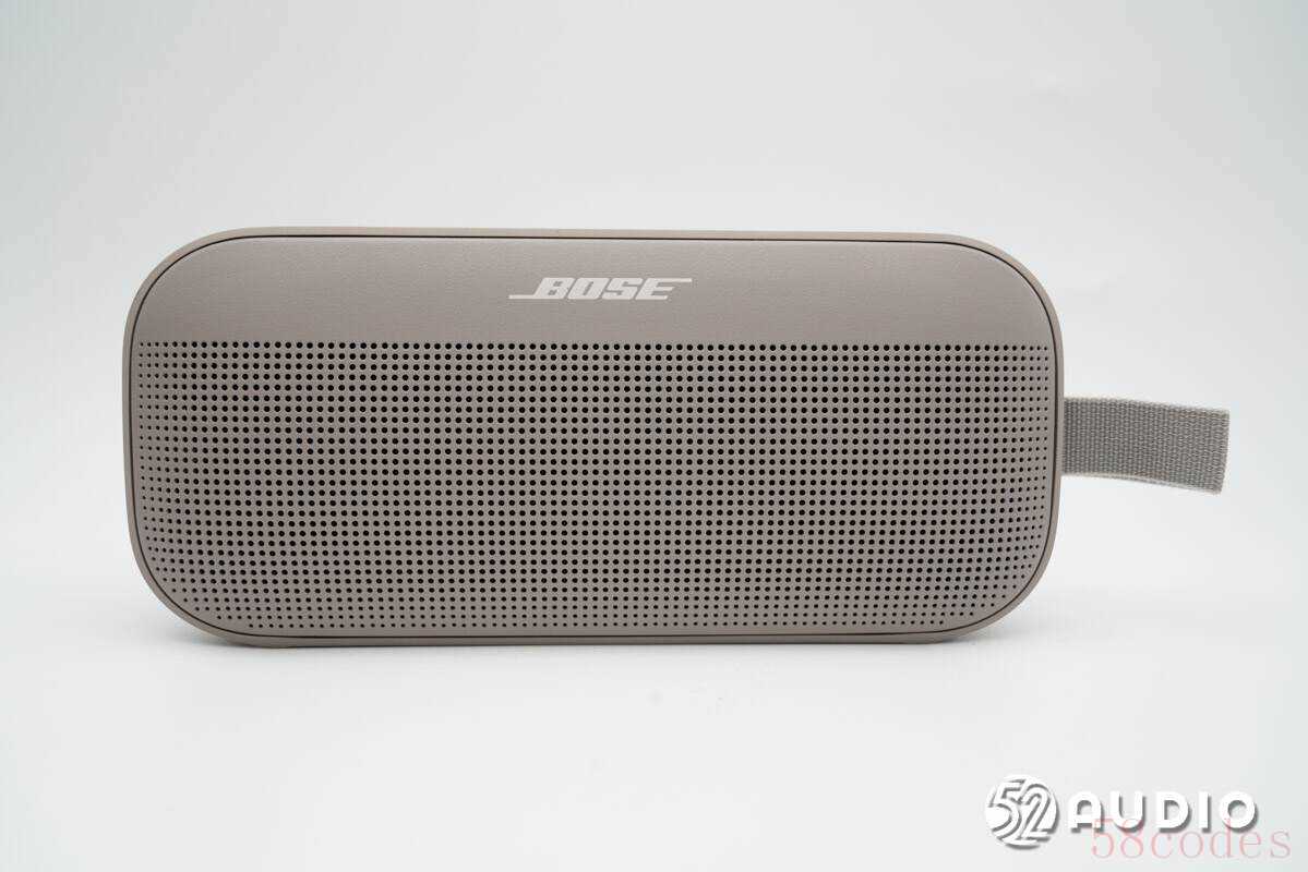 BOSE SoundLink Flex蓝牙扬声器Ⅱ延续了上代的圆角方形设计,机身顶部出音孔采用了金属盖板,设计有“BOSE”品牌LOGO。