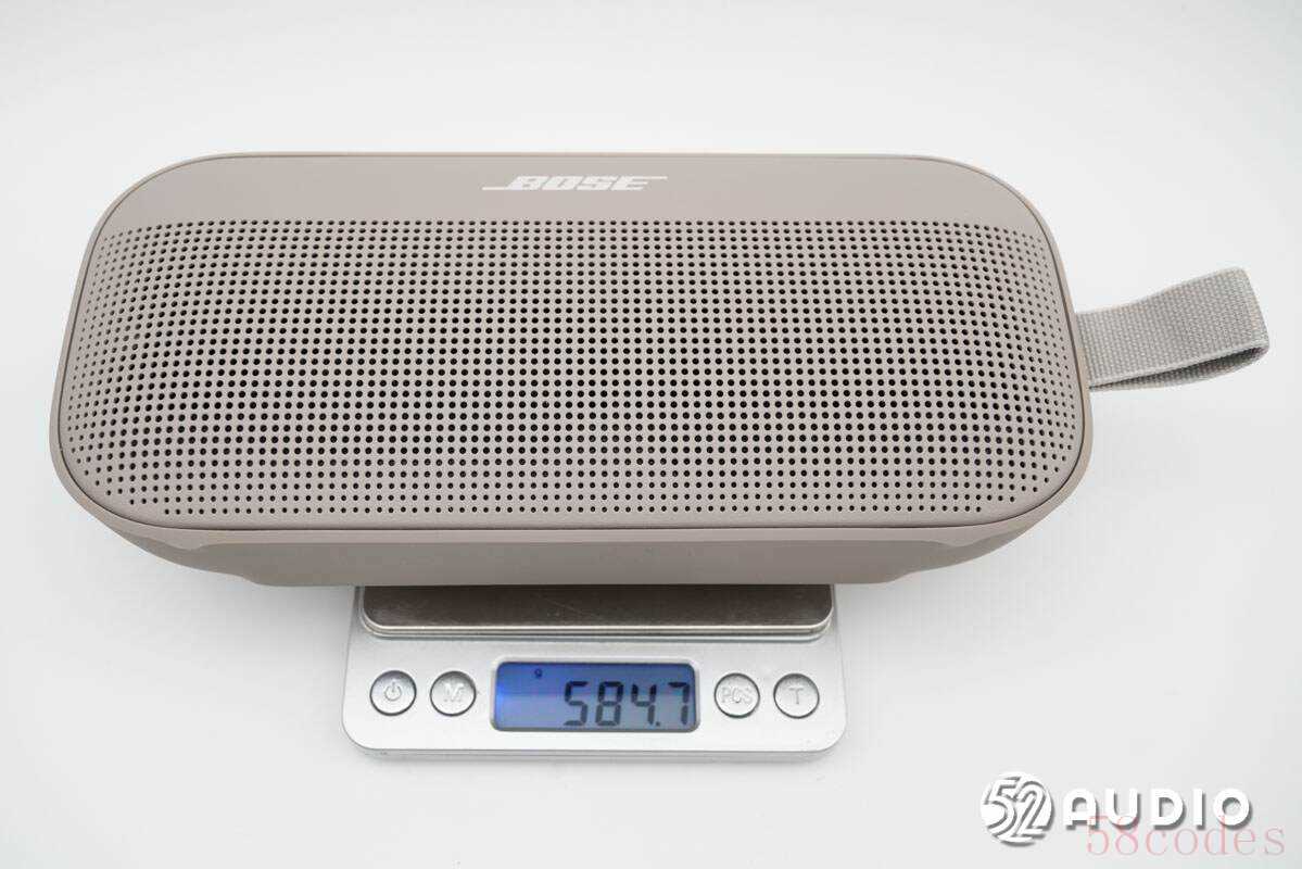 经我爱音频网实测,BOSE SoundLink Flex蓝牙扬声器Ⅱ重量约为584.7g。