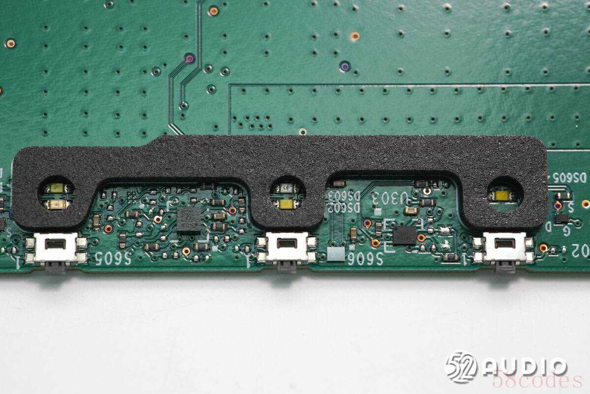 三颗功能按键和LED指示灯特写。指示灯设置有遮光罩密封。