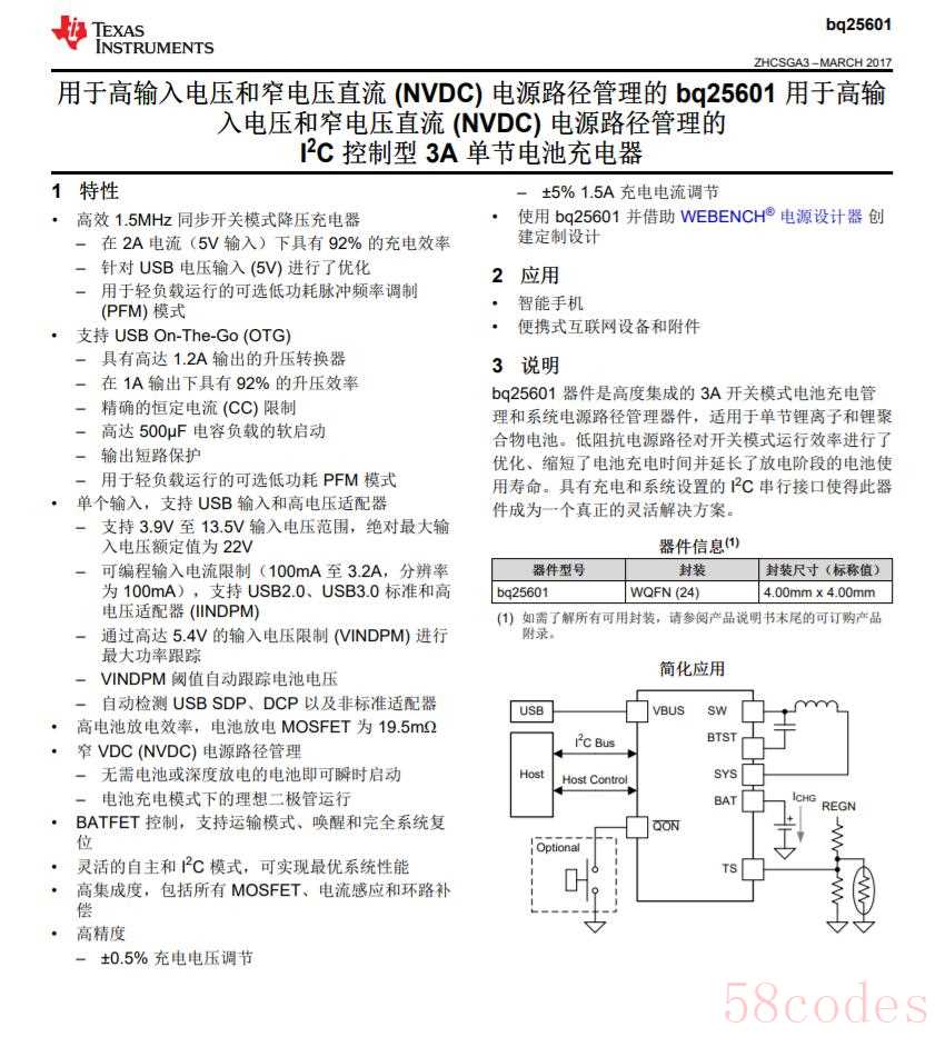 TI德州仪器BQ25601充电IC,是高度集成的3A开关模式电池充电管理和系统电源路径管理器件,适用于单节锂离子和锂聚合物电池。低阻抗电源路径对开关模式运行效率进行了优化、缩短了电池充电时间并延长了放电阶段的电池使用寿命。BQ25601还具有充电和系统设置的I²C串行接口,使其能够非常灵活的应用。