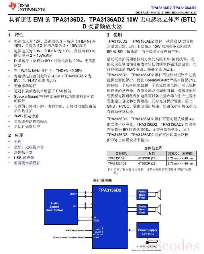 TI德州仪器TPA3136D2是一款高效D类音频功率放大器,适用于以高达10W的功率驱动阻抗为6Ω或8Ω(每通道)的桥接式立体声扬声器。借助采用扩展频谱控制方案的高级EMI抑制技术,既能实现在输出端使用成本较低的铁氧体磁珠滤波器,同时能够满足EMC要求,降低了系统成本。