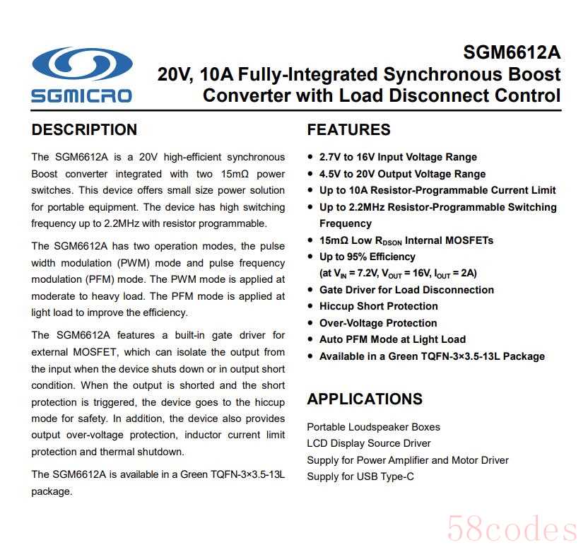 SGMICRO圣邦微SGM6612A是一款集成了两个15mΩ电源开关的20V高效同步升压转换器,具有高达2.2MHz的开关频率,电阻可编程。该设备为便携式设备提供了小尺寸电源解决方案。