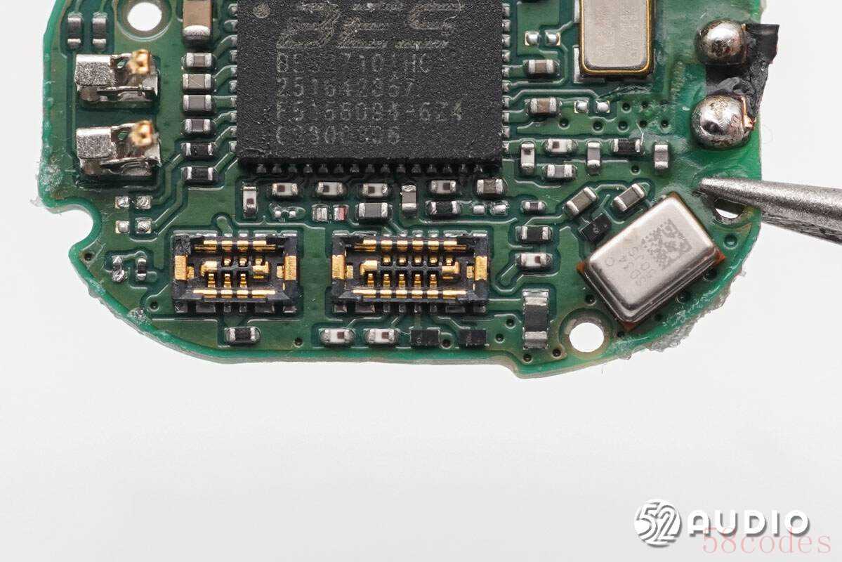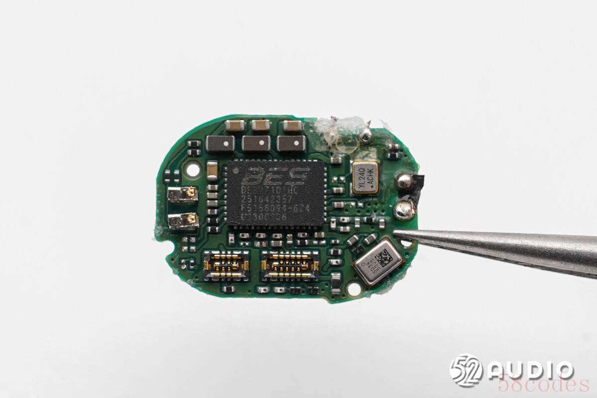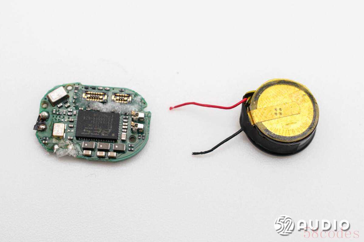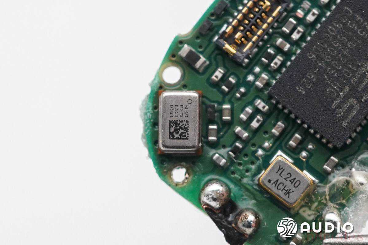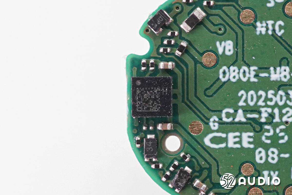 耳机音腔内部搭载了12mm动圈单元,内置聆听通话麦克风和VPU麦克风拾音。后端腔体内置主板和46mAh钢壳扣式电池。主板上,搭载一颗MEMS麦克风拾音;采用BES恒玄科技BES2710IHC蓝牙音频SoC用于无线连接和音频数据处理,外围配备多颗Sunlord顺络电子SDCL0603Q系列叠层陶瓷电感;其他还采用了六轴陀螺仪,用于空间音频功能。