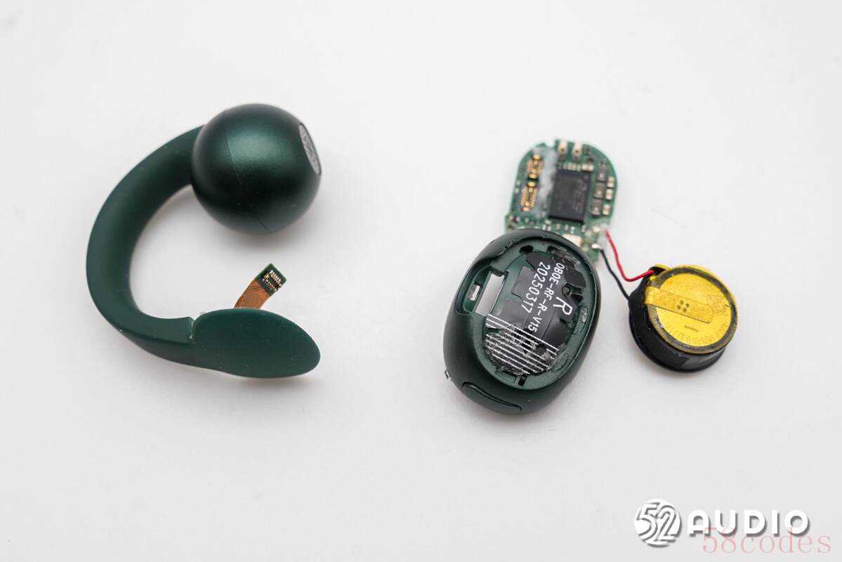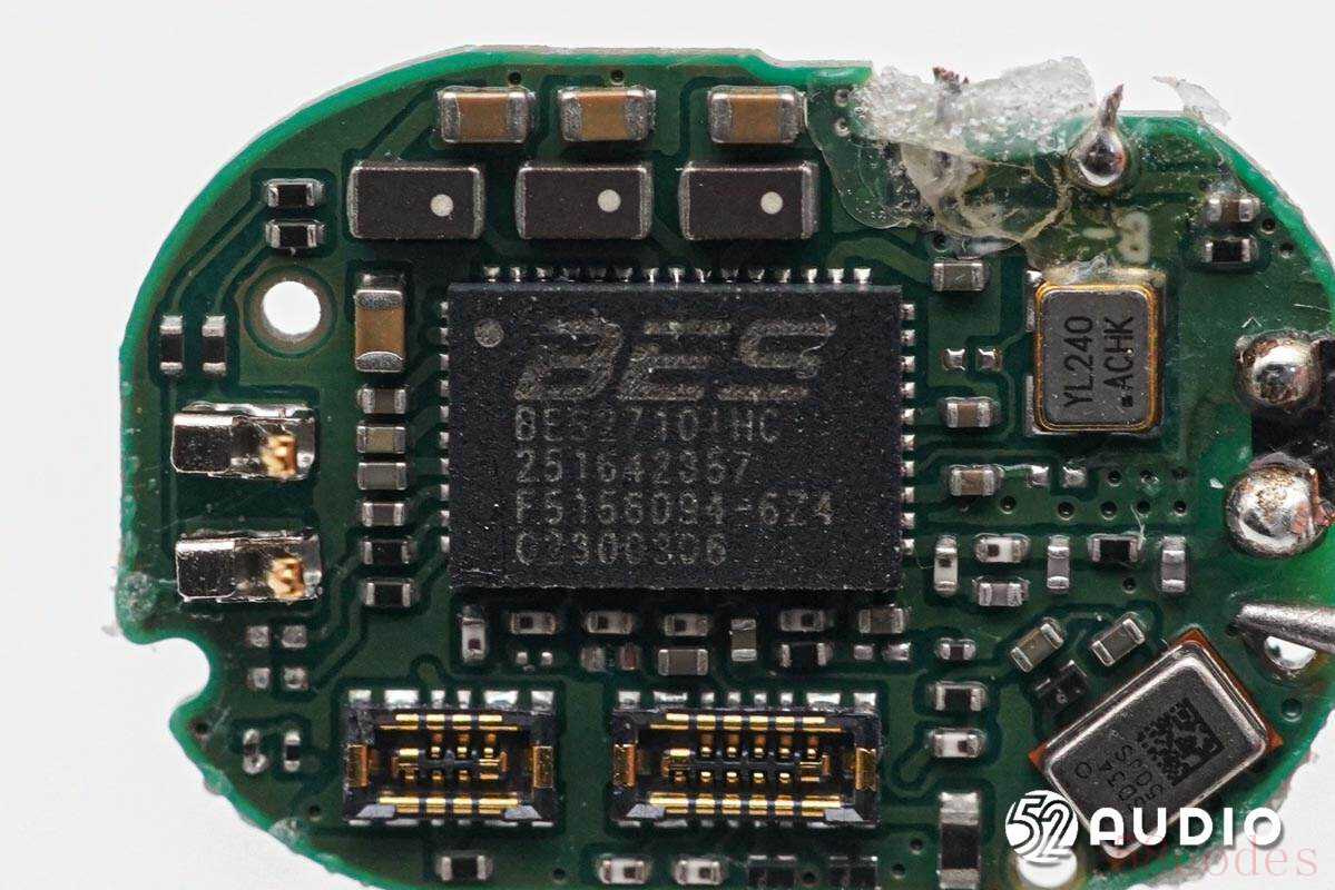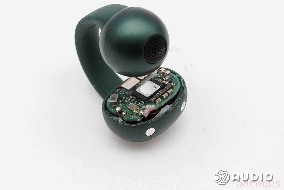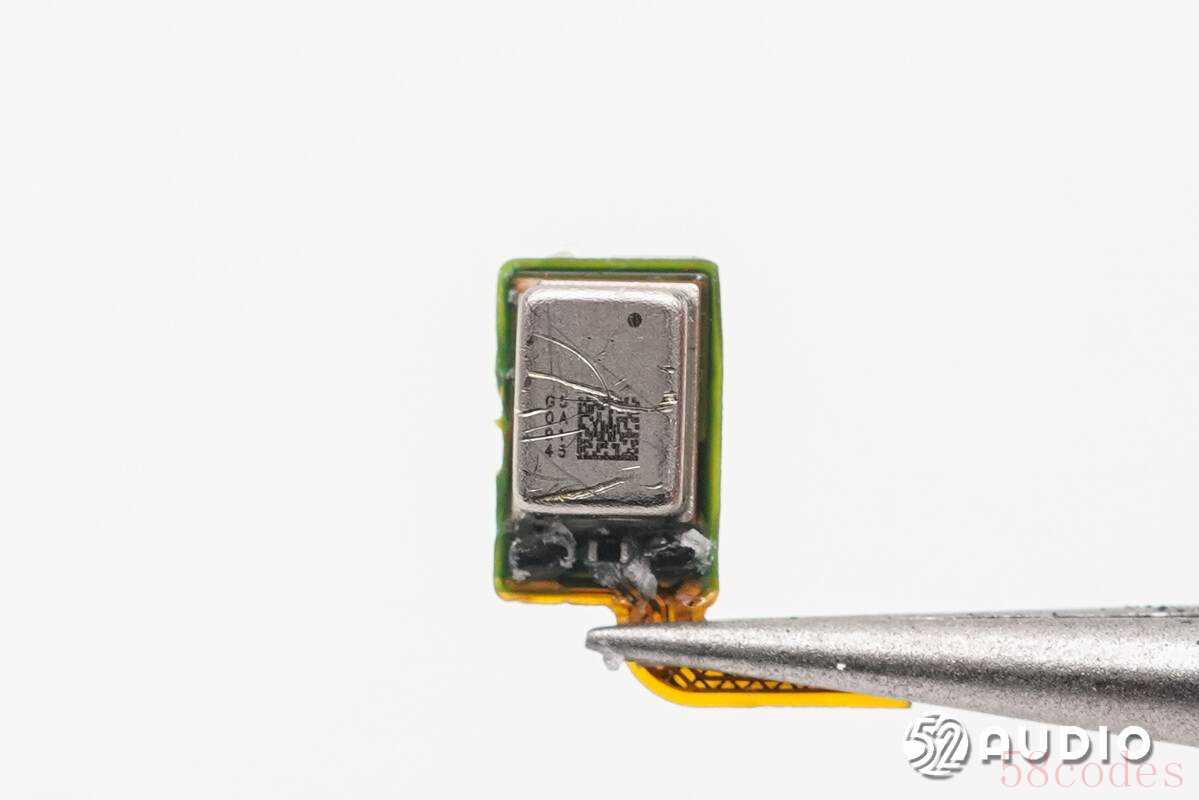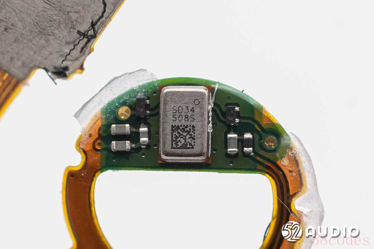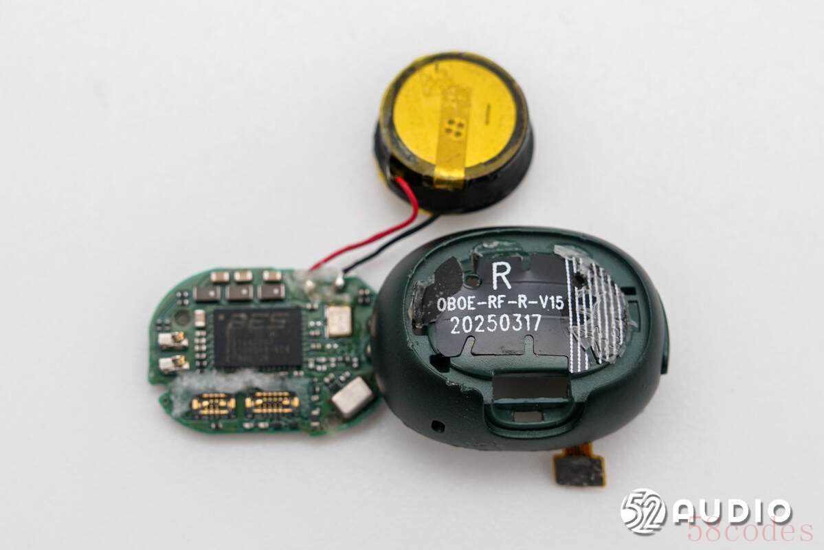 耳机音腔内部搭载了12mm动圈单元,内置聆听通话麦克风和VPU麦克风拾音。后端腔体内置主板和46mAh钢壳扣式电池。主板上,搭载一颗MEMS麦克风拾音;采用BES恒玄科技BES2710IHC蓝牙音频SoC用于无线连接和音频数据处理,外围配备多颗Sunlord顺络电子SDCL0603Q系列叠层陶瓷电感;其他还采用了六轴陀螺仪,用于空间音频功能。