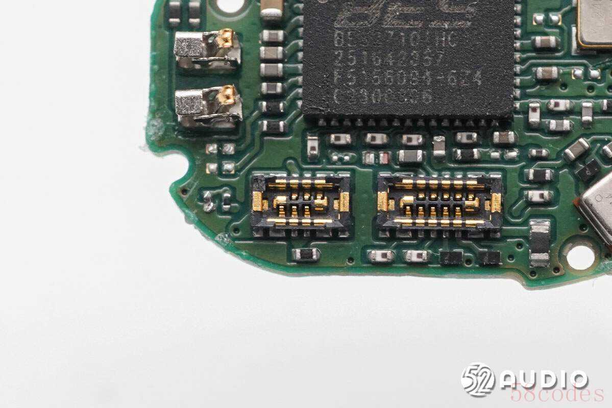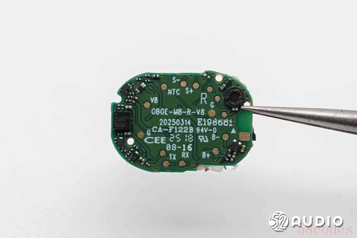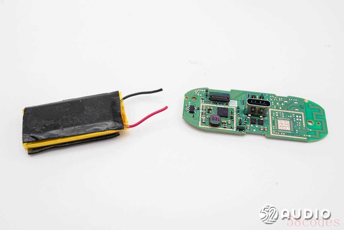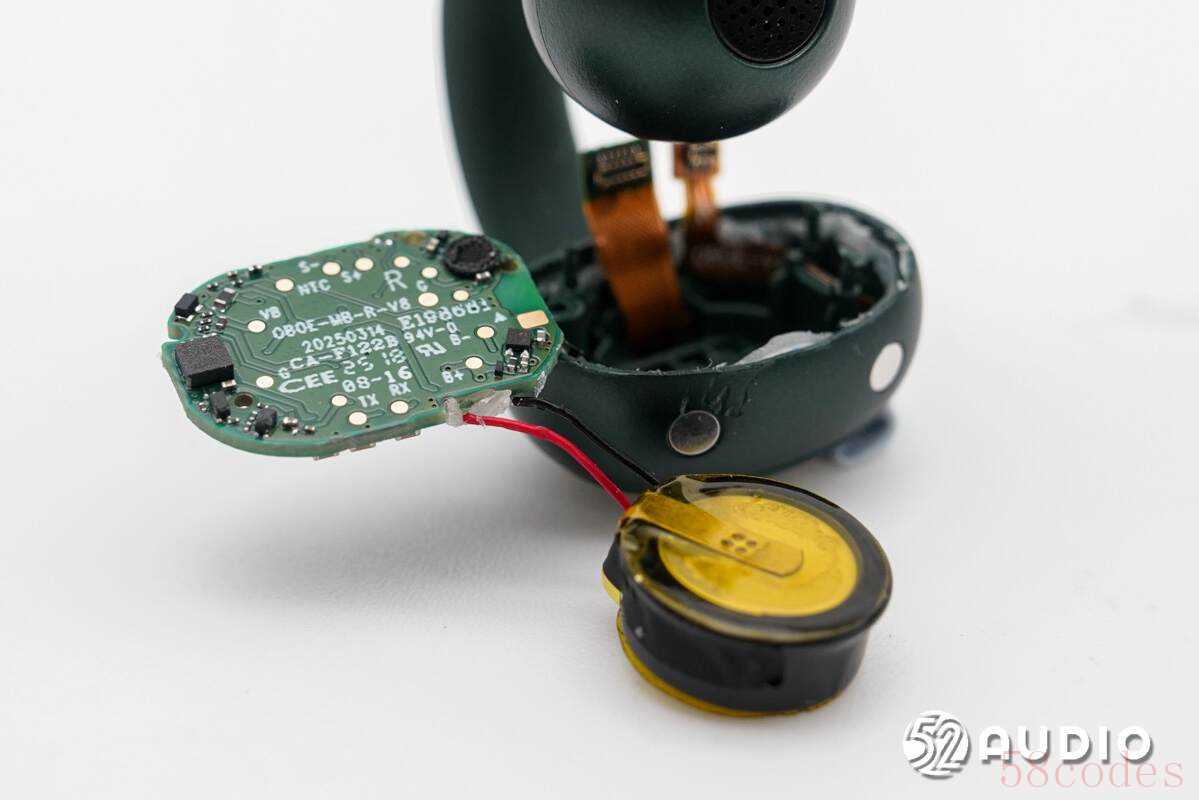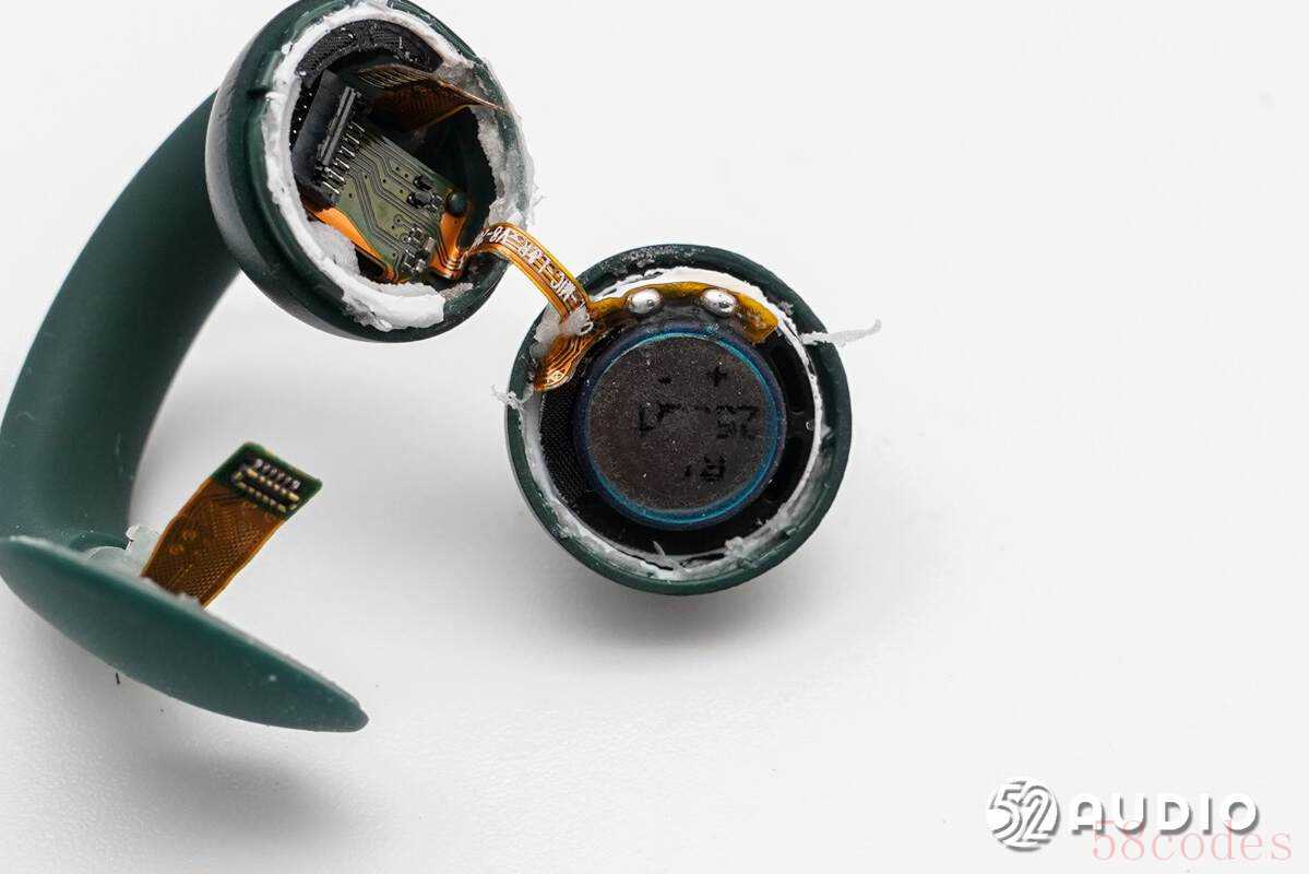 耳机音腔内部搭载了12mm动圈单元,内置聆听通话麦克风和VPU麦克风拾音。后端腔体内置主板和46mAh钢壳扣式电池。主板上,搭载一颗MEMS麦克风拾音;采用BES恒玄科技BES2710IHC蓝牙音频SoC用于无线连接和音频数据处理,外围配备多颗Sunlord顺络电子SDCL0603Q系列叠层陶瓷电感;其他还采用了六轴陀螺仪,用于空间音频功能。