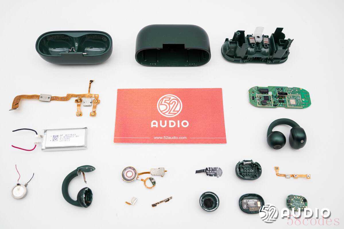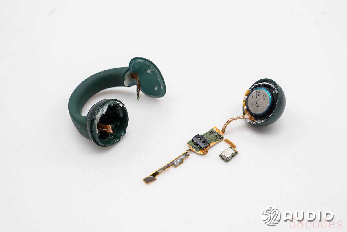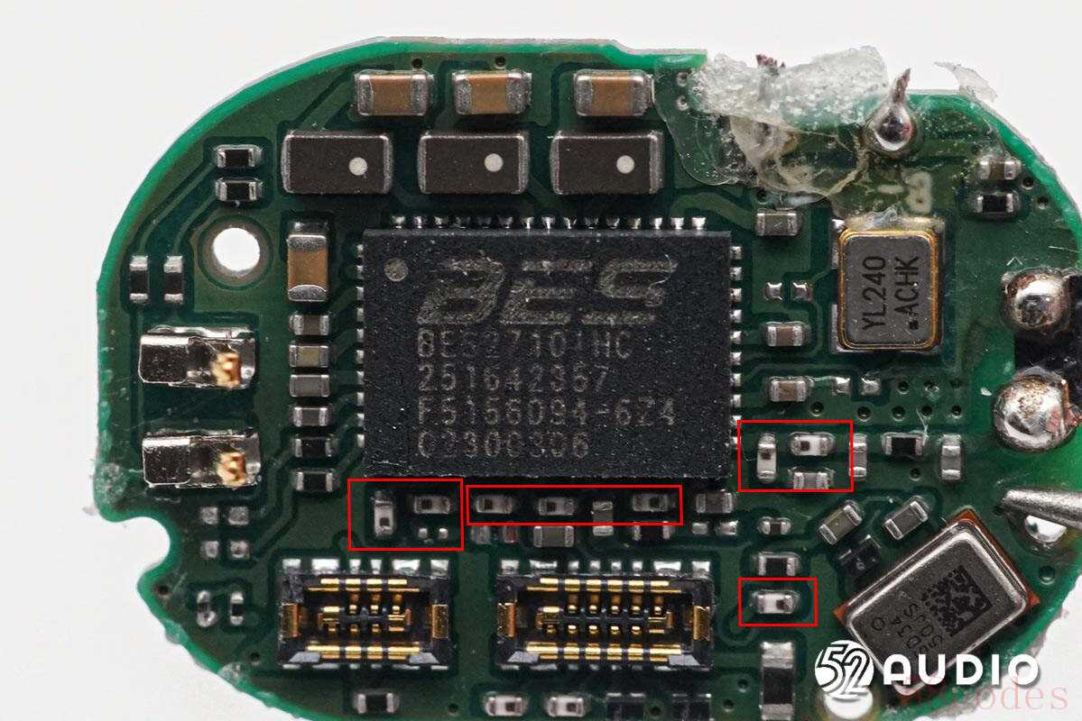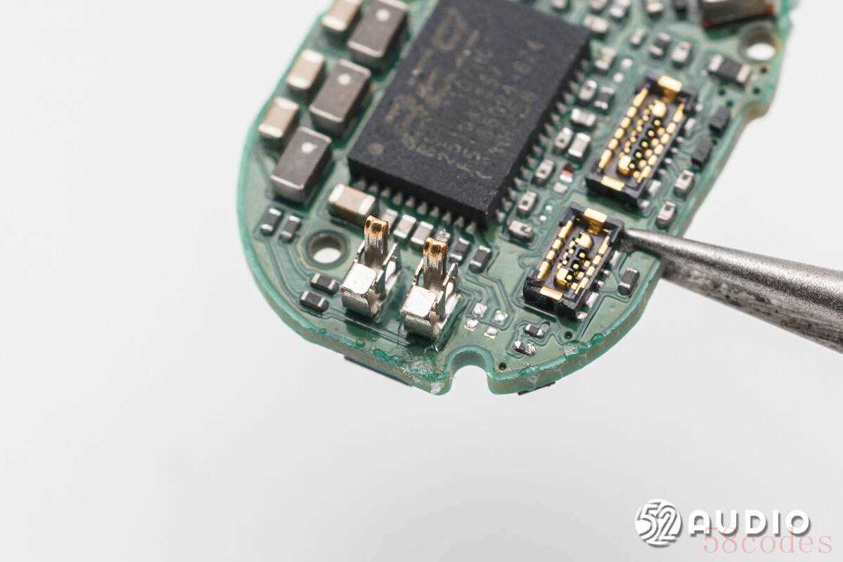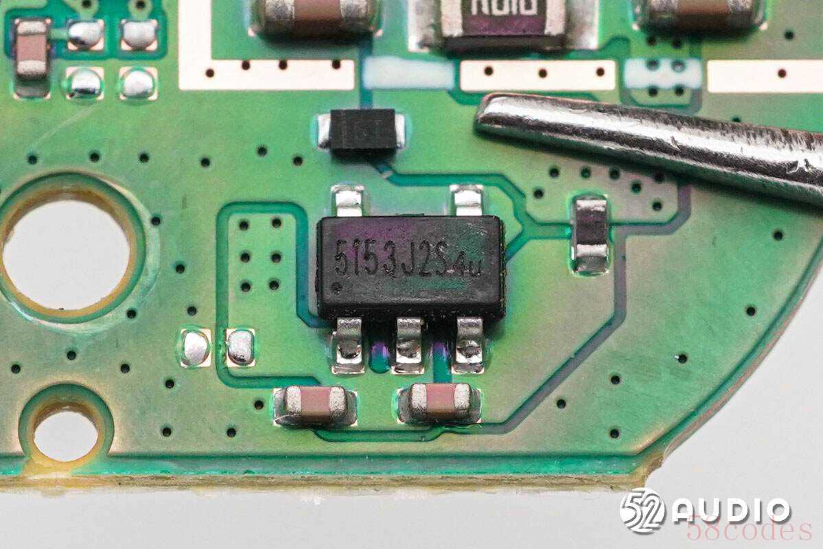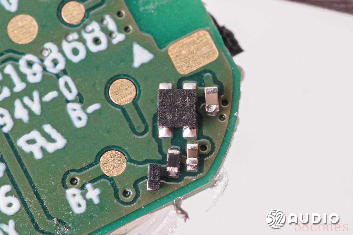 耳机音腔内部搭载了12mm动圈单元,内置聆听通话麦克风和VPU麦克风拾音。后端腔体内置主板和46mAh钢壳扣式电池。主板上,搭载一颗MEMS麦克风拾音;采用BES恒玄科技BES2710IHC蓝牙音频SoC用于无线连接和音频数据处理,外围配备多颗Sunlord顺络电子SDCL0603Q系列叠层陶瓷电感;其他还采用了六轴陀螺仪,用于空间音频功能。