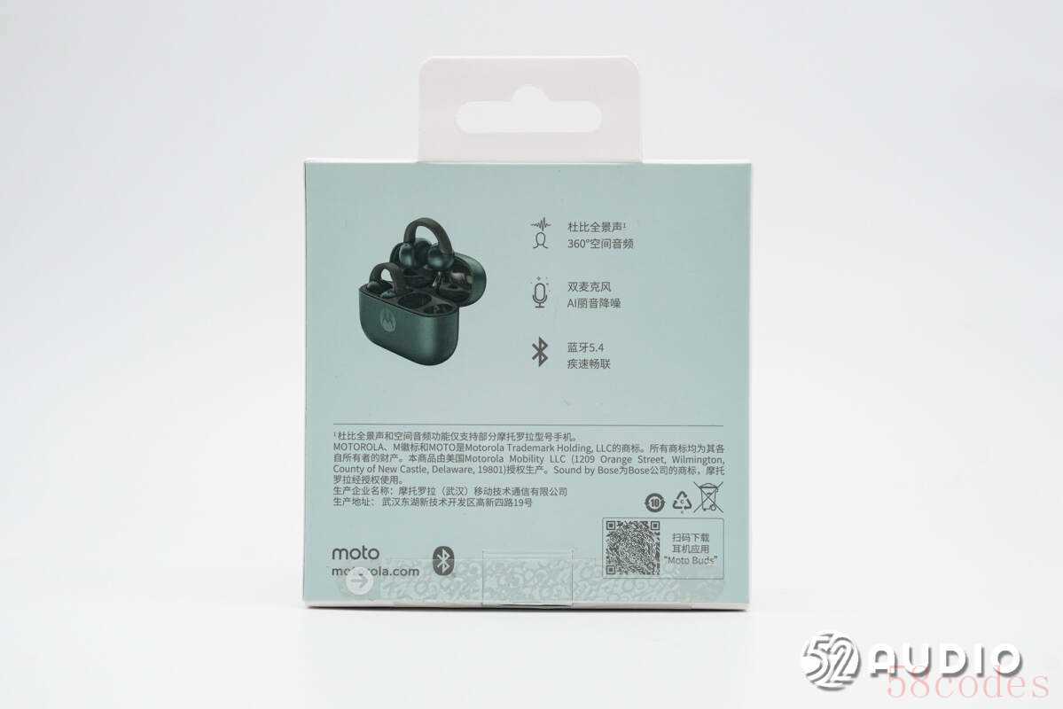 包装盒背面展示有产品的整体外观,杜比全景声 360°空间音频、双麦克风AI丽音降噪、蓝牙5.4极速畅联的产品特点,耳机App下载二维码,以及商标和生产企业摩托罗拉(武汉)移动技术通信有限公司的信息等。