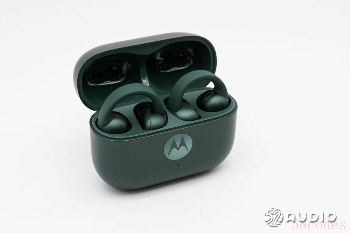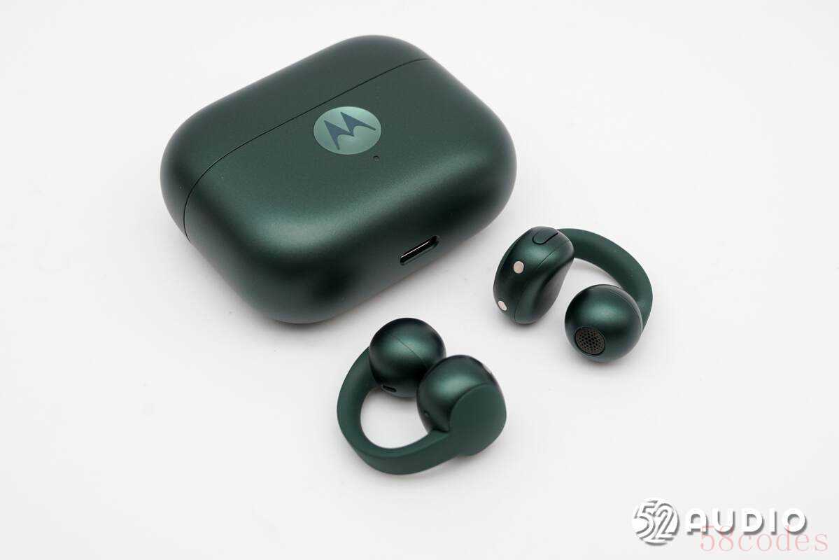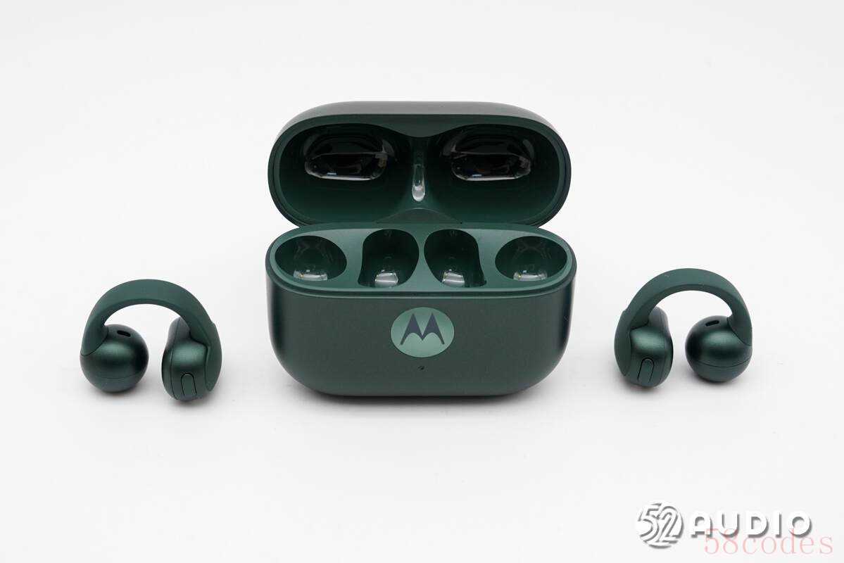 联想moto buds Clip开放式耳夹耳机在外观方面,充电盒采用了圆角方形设计,磨砂质感,体积轻巧便携。PANTONE 19-5411 TPG“绿野仙踪”配色观感高雅时尚,搭配经典摩托罗拉铭牌装饰,极具辨识度。耳夹式耳机采用不易变形的镍钛形状记忆合金,通过亲肤硅胶材质包裹,搭配符合人耳结构的曲线设计,提供了舒适的佩戴体验。