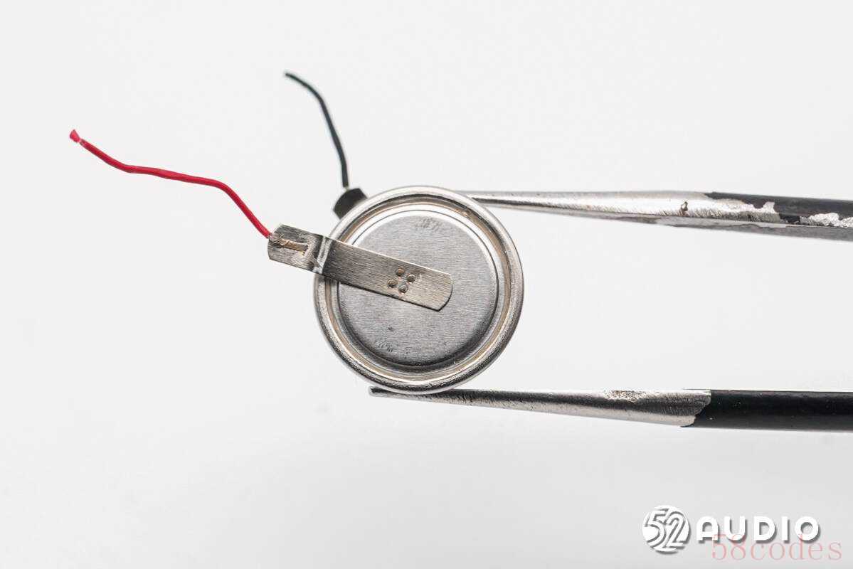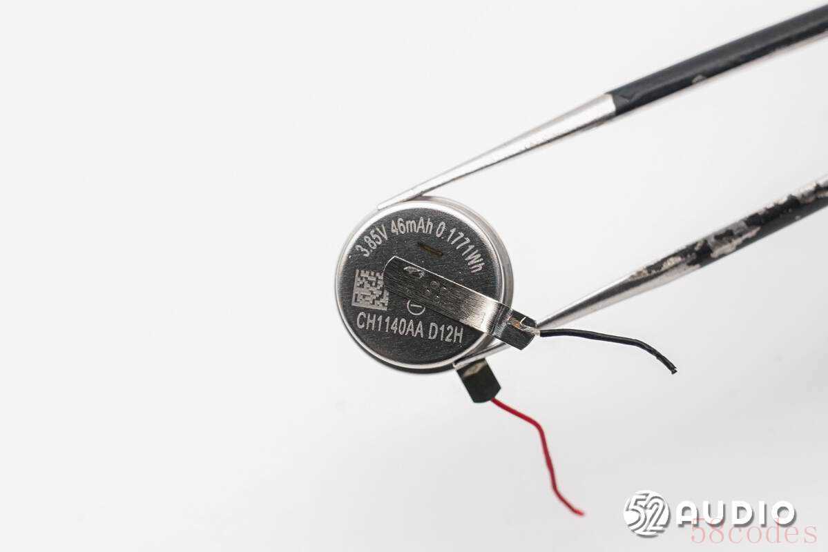 耳机内置钢壳扣式电池负极特写,雕刻参数信息。标称电压:3.85V,额定容量:46mAh 0.1771Wh。