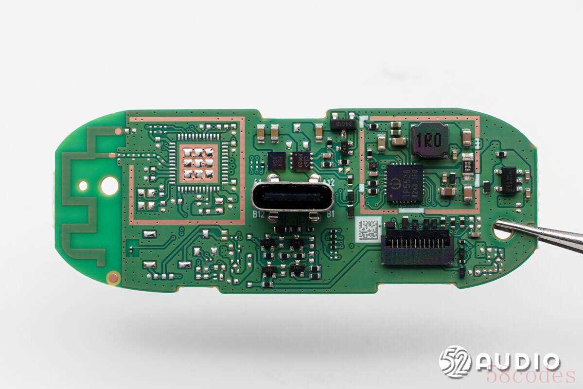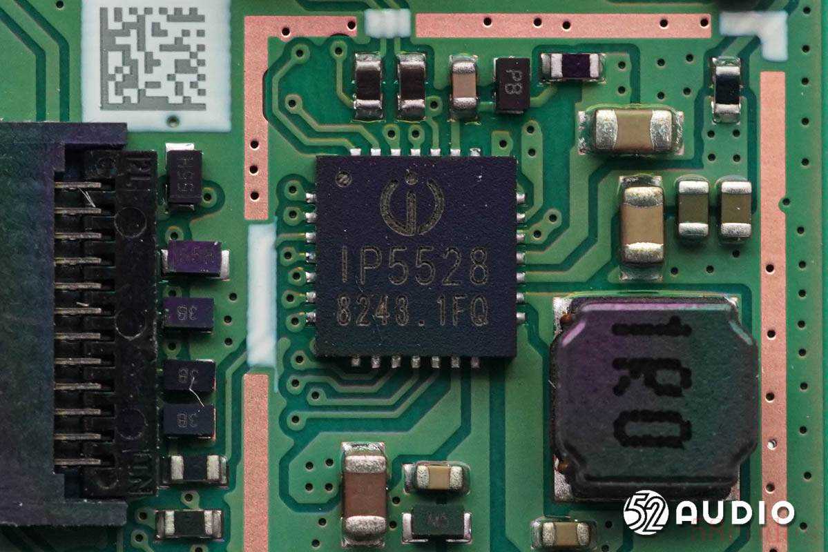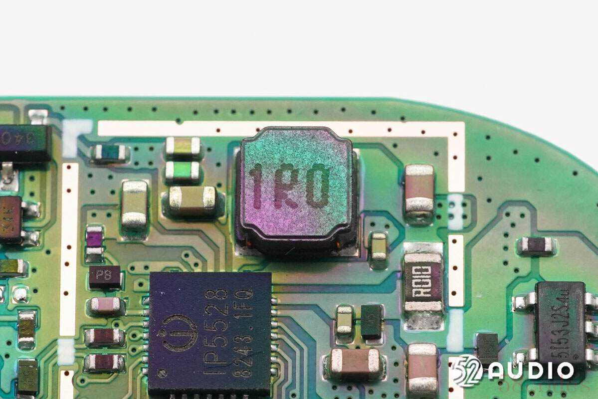 内部主要配置方面,充电盒搭载了GF新余赣锋510mAh锂电池,采用Type-C接口输入电源,端口设置有过压过流保护IC和TVS管;采用INJOINIC英集芯IP5528充电仓管理SoC负责电池的充放电管理和整机控制,支持跟随充电功能,可有效提升15%~20%充电盒电池到耳机电池的转换效率,使品牌厂商可以在电池容量、外观体积和功能性上做更灵活的权衡。