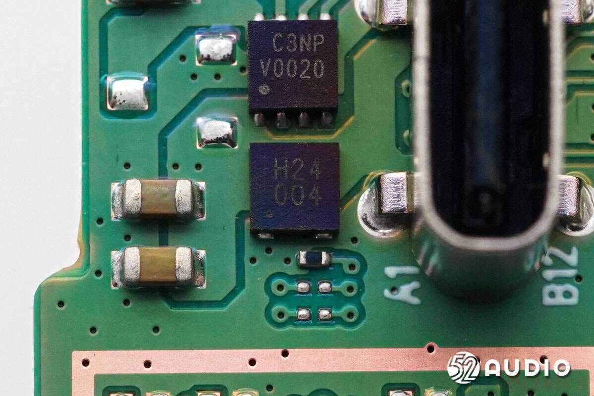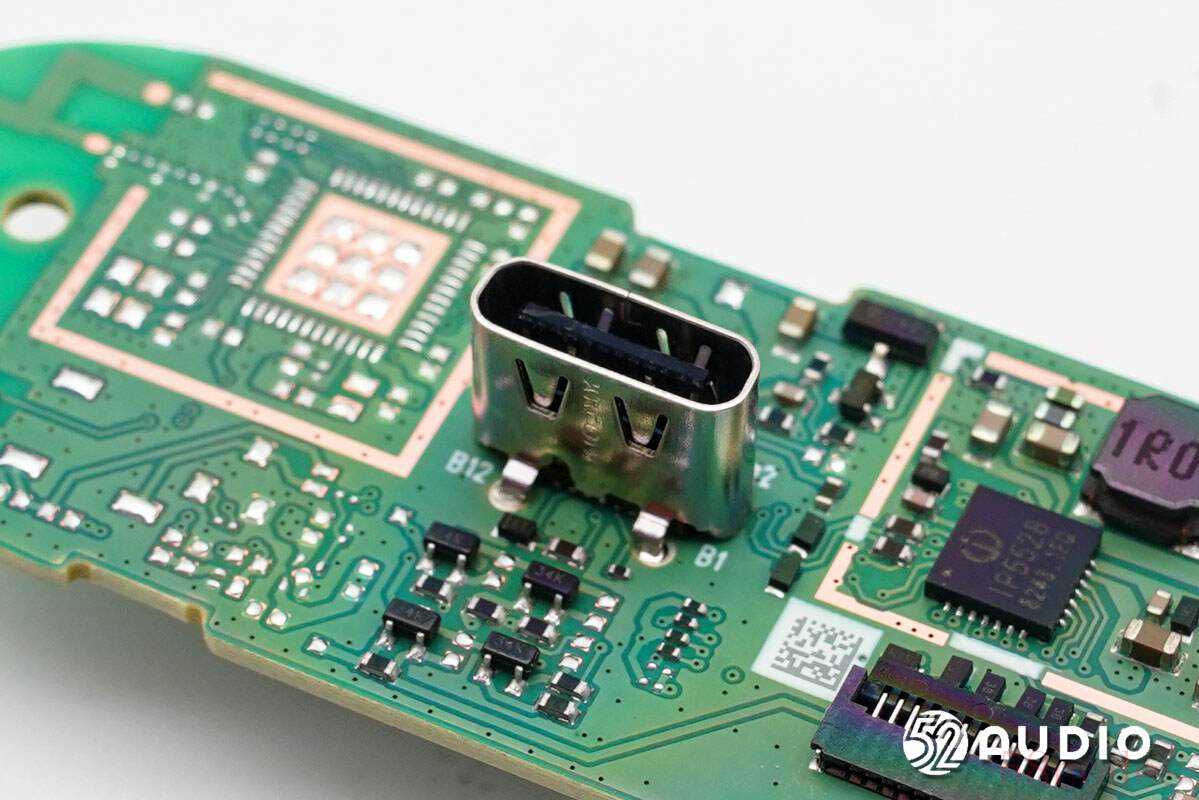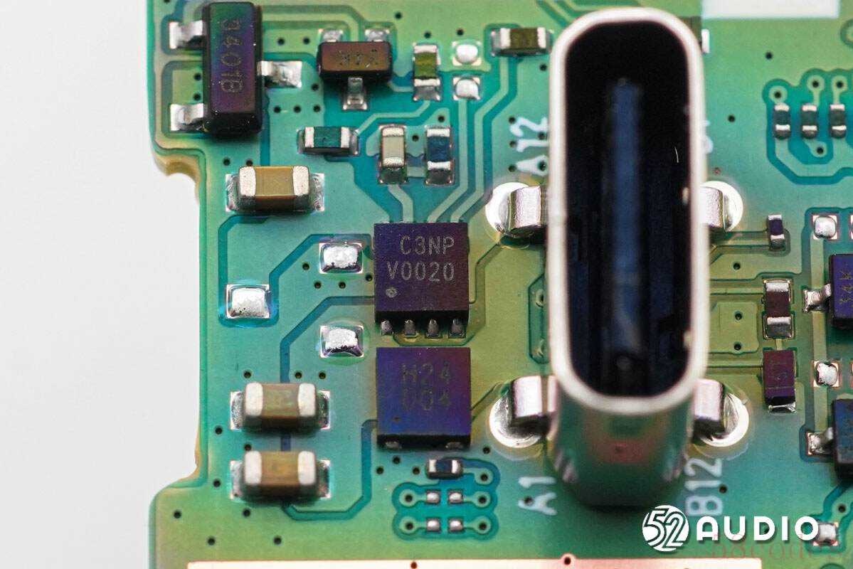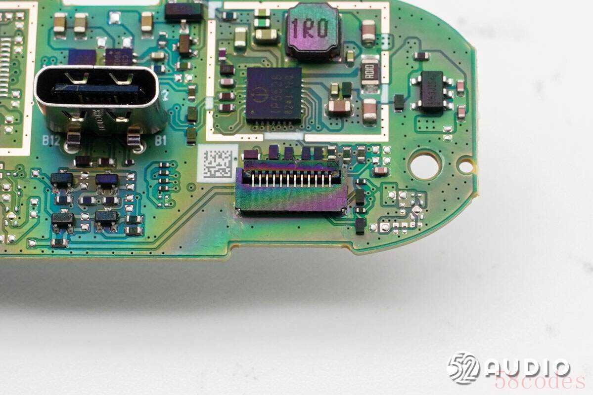 内部主要配置方面,充电盒搭载了GF新余赣锋510mAh锂电池,采用Type-C接口输入电源,端口设置有过压过流保护IC和TVS管;采用INJOINIC英集芯IP5528充电仓管理SoC负责电池的充放电管理和整机控制,支持跟随充电功能,可有效提升15%~20%充电盒电池到耳机电池的转换效率,使品牌厂商可以在电池容量、外观体积和功能性上做更灵活的权衡。