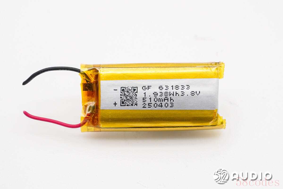 充电盒内置锂电池型号:GF 631833,额定容量:510mAh 1.938Wh,标称电压:3.8V,来自GF新余赣锋。