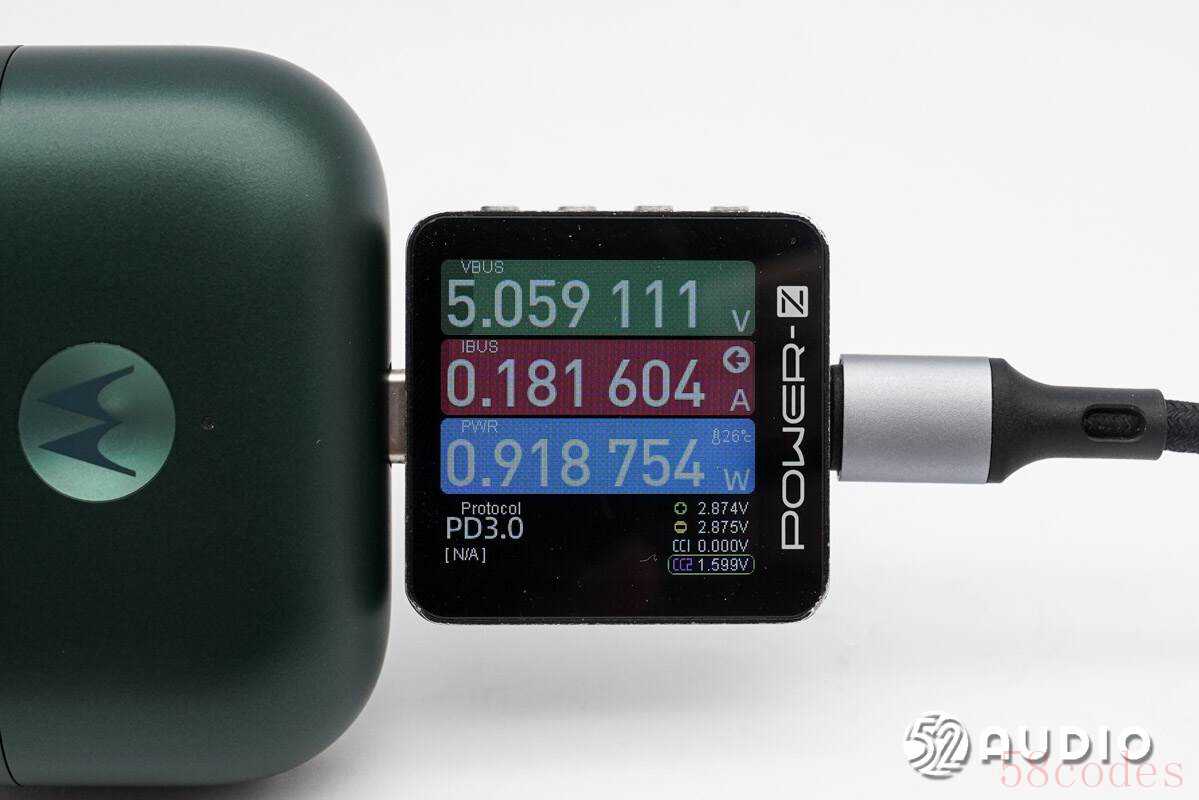 我爱音频网采用CHARGERLAB POWER-Z KM003C对联想moto buds Clip开放式耳夹耳机进行充电测试,输入功率约为0.92W。