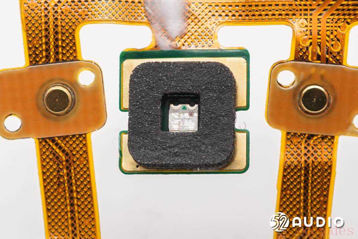 盖板内侧结构一览,贴有佩戴检测传感器,用于实现摘取自动暂停音乐播放,佩戴自动恢复播放功能。