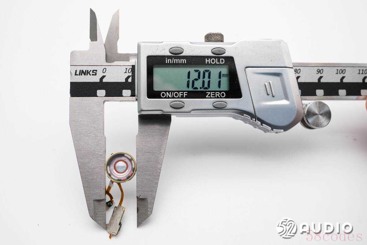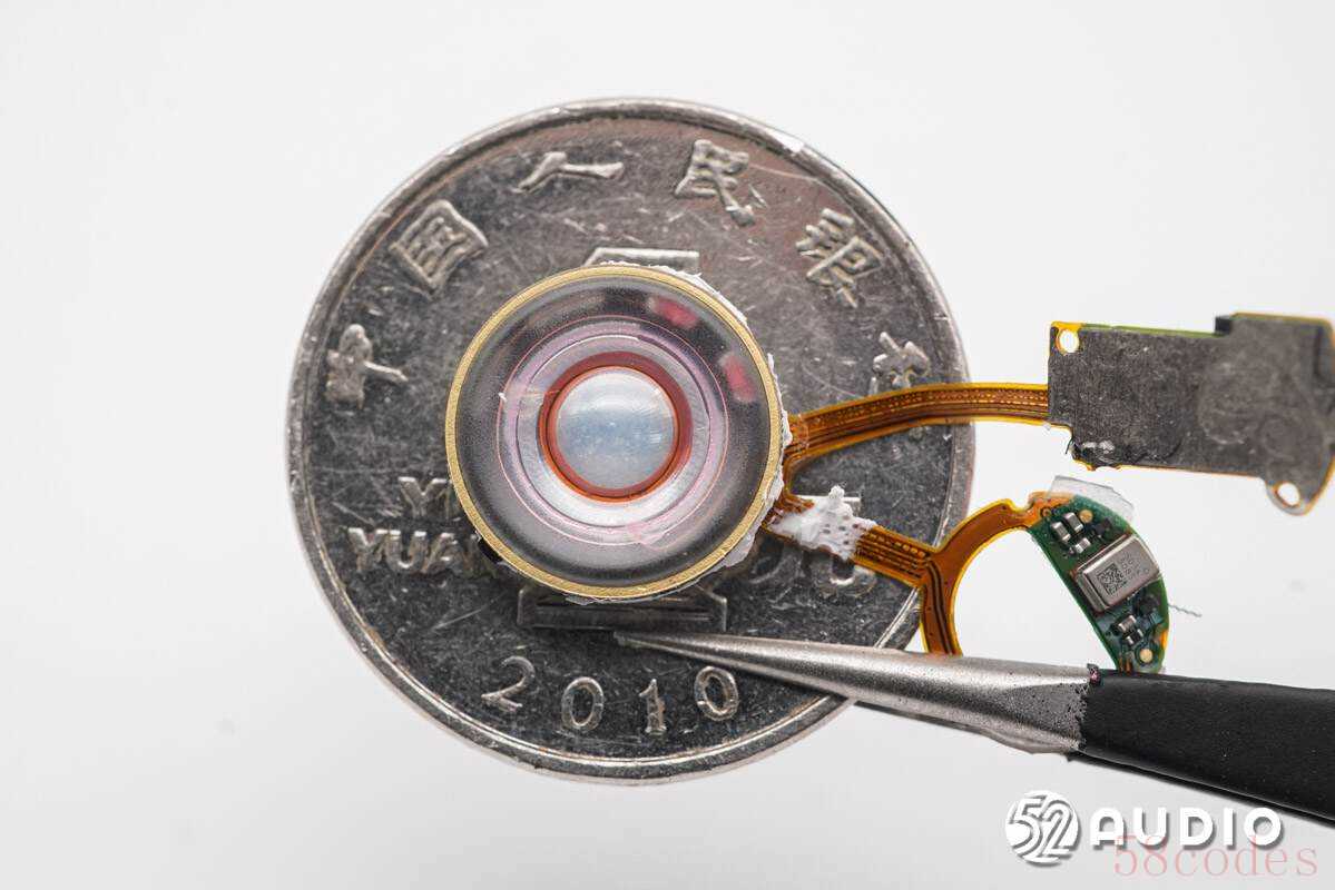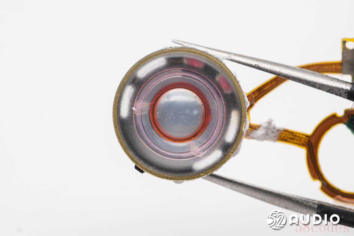 耳机扬声器特写。据官方介绍,采用了无铁5磁类钻石动圈单元,复合式DLC类钻石碳纤维特种膜片(TPU+DLC),最大振膜振幅0.45mm。