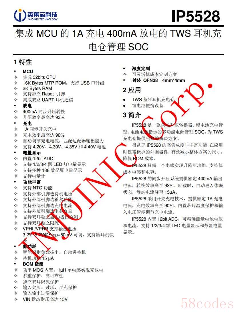 INJOINIC英集芯IP5528 TWS耳机充电仓管理SoC,是一款集成MCU、升压转换器、锂电池充电管理、电池电量指示的多功能电源管理SOC,为TWS充电仓提供完整的解决方案。 得益于IP5528的高集成度与丰富功能,在应用时仅需极少的外围器件,有效减小整体方案的尺寸, 降低BOM成本。