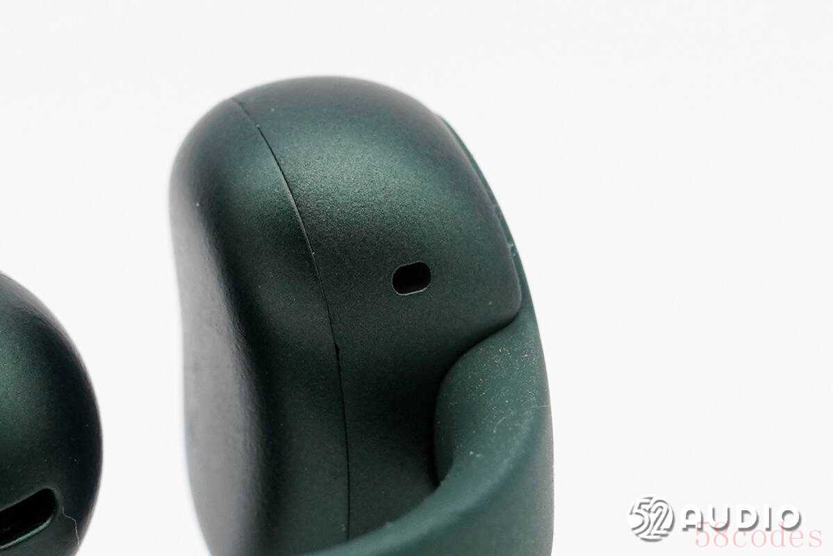 腔体顶部的耳后防风麦克风拾音孔特写,佩戴时位于耳后,能够有效降低风噪影响。