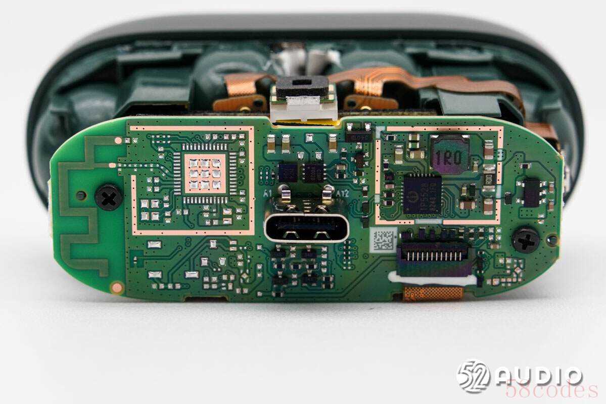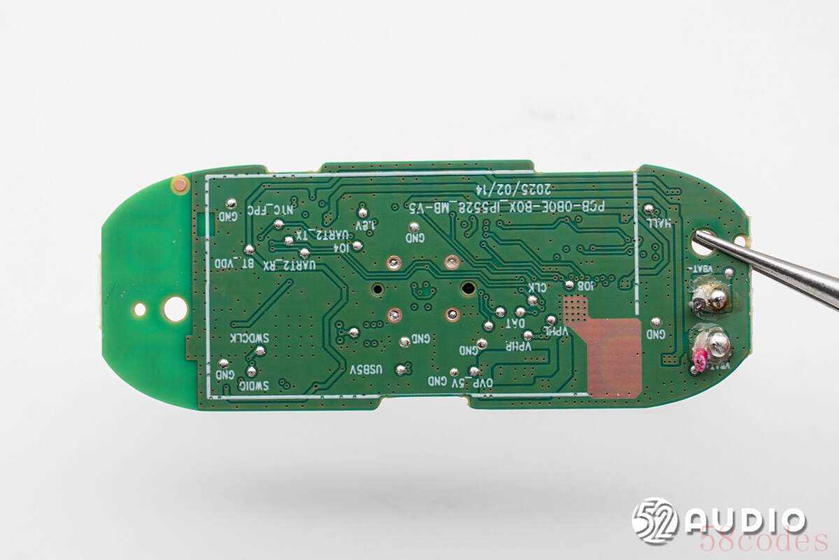 充电盒主板一侧电路一览,左侧设置有天线和预留的焊盘,推测后续还有更高版本的产品。