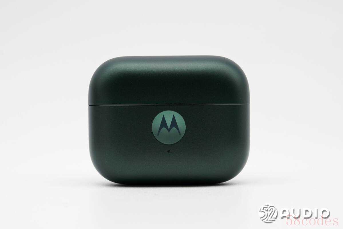moto buds Clip开放式耳夹耳机充电盒采用了圆角方形设计,磨砂质感,PANTONE 19-5411 TPG配色,高雅时尚。机身正面设计品牌LOGO,设置有一颗指示灯反馈蓝牙配对和充电状态。
