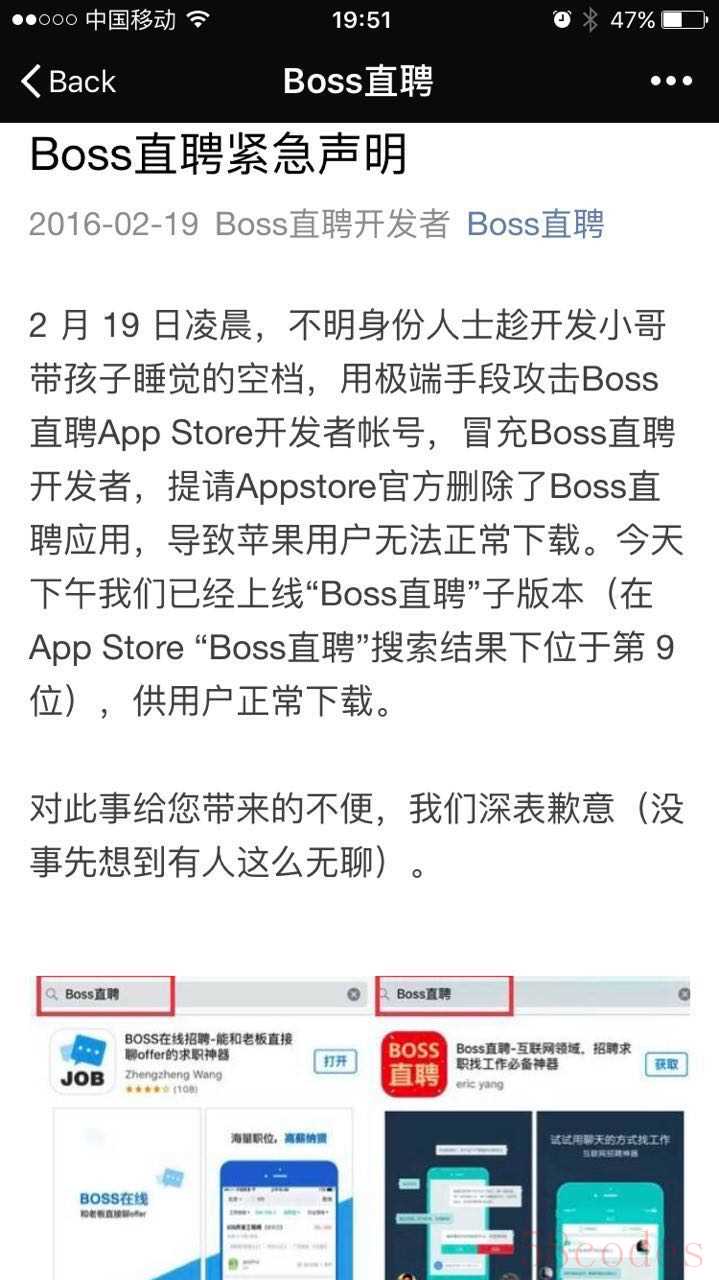 2月19日,Boss直聘在官方微信发布声明称,当日凌晨有“不明身份人士”用极端手段攻击Boss直聘App Store开发者帐号,删除了Boss直聘应用,导致用户无法正常下载。有报道称,该声明暗指是其直接竞争对手拉勾网所为。