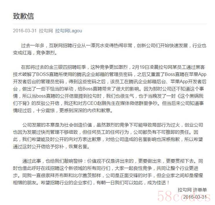 3月31日,拉勾网在其微信公众号发布署名为董事长许单单的致歉信,承认“2月19日凌晨拉勾网某员工通过黑客技术破解了Boss直聘所使用的腾讯企业邮箱的管理员密码,做出了一些不恰当的举动”,并“向对方表达歉意”。