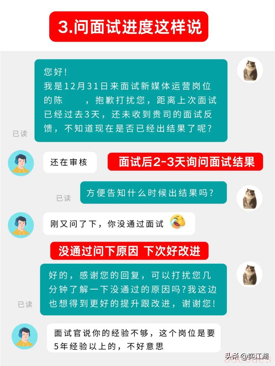3、询问面试的进度或者反馈(这个一定是自己感兴趣的公司以及自己面试的时候感受很不错的,你自己面试感觉很差的话淘汰还有悬念吗?)