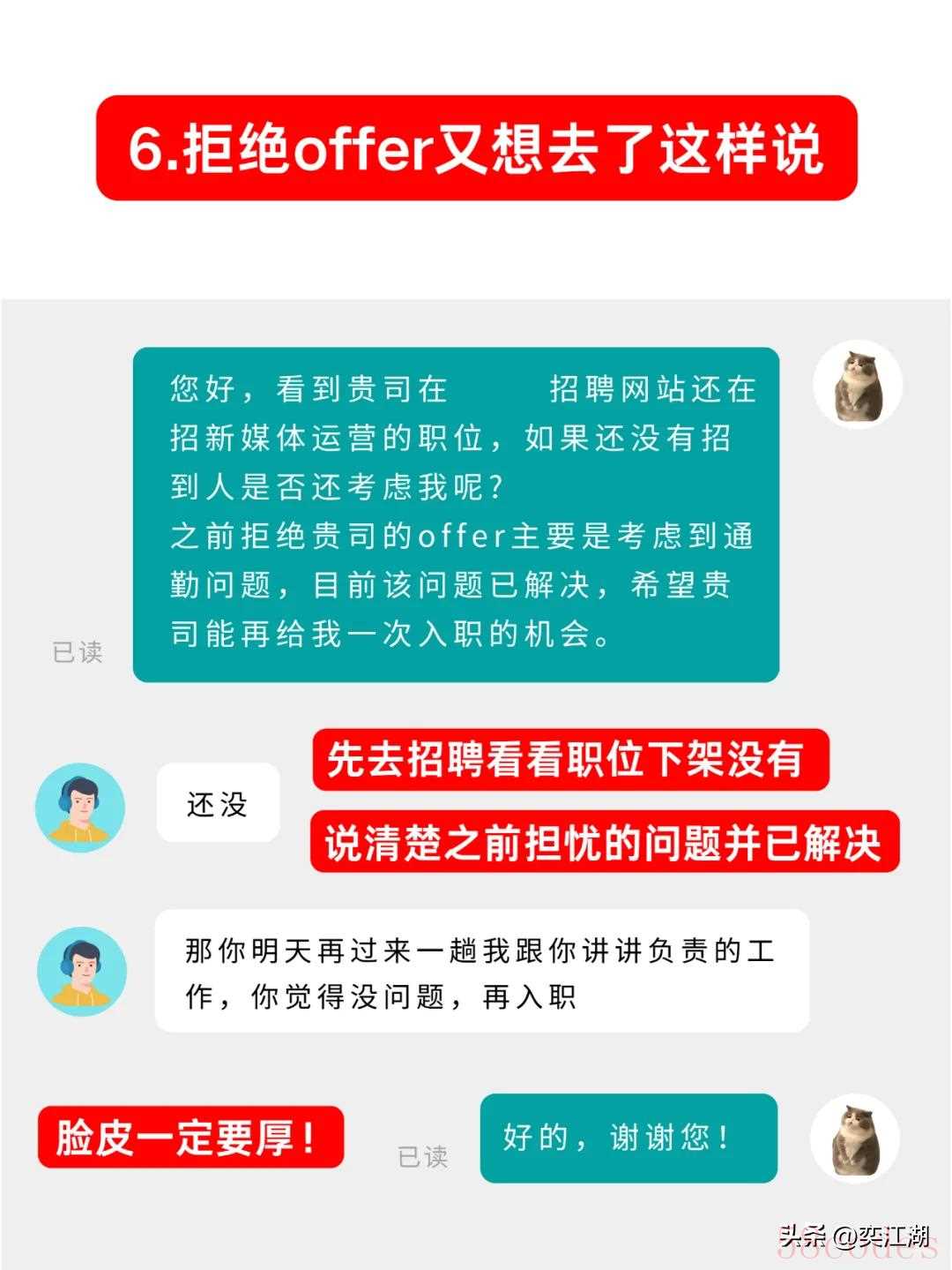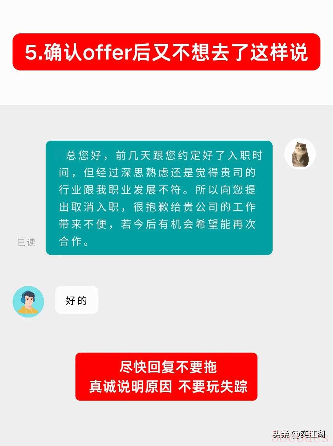 5、当你确认了offer之后,又不想去,不管是有了其他的选择还是有什么变动,一定要委婉的表达自己的想法,且尽量及时回复,千万不要拖了又拖