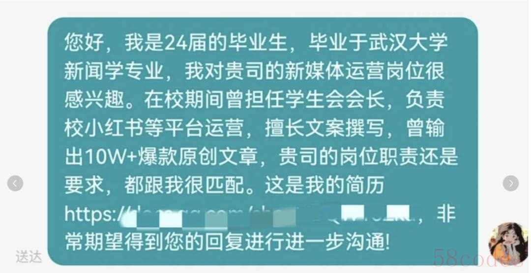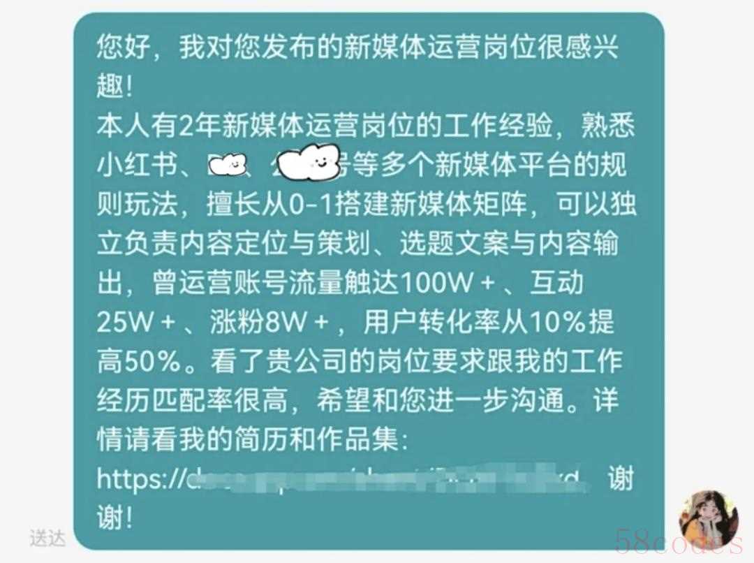“您好!我对贵司招聘的新媒体岗位非常感兴趣。我是XX大学的广告专业毕业,也是抖音平台的资深用户,在爆款选题、文案撰写上有自己的方法论,熟练使用剪映、PS第工具。我觉得跟贵司岗位JD很匹配,请您查看我的简历,如果合适,可以安排面试进一步沟通,期待您的回复。”
